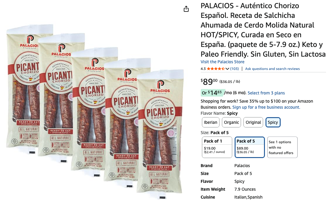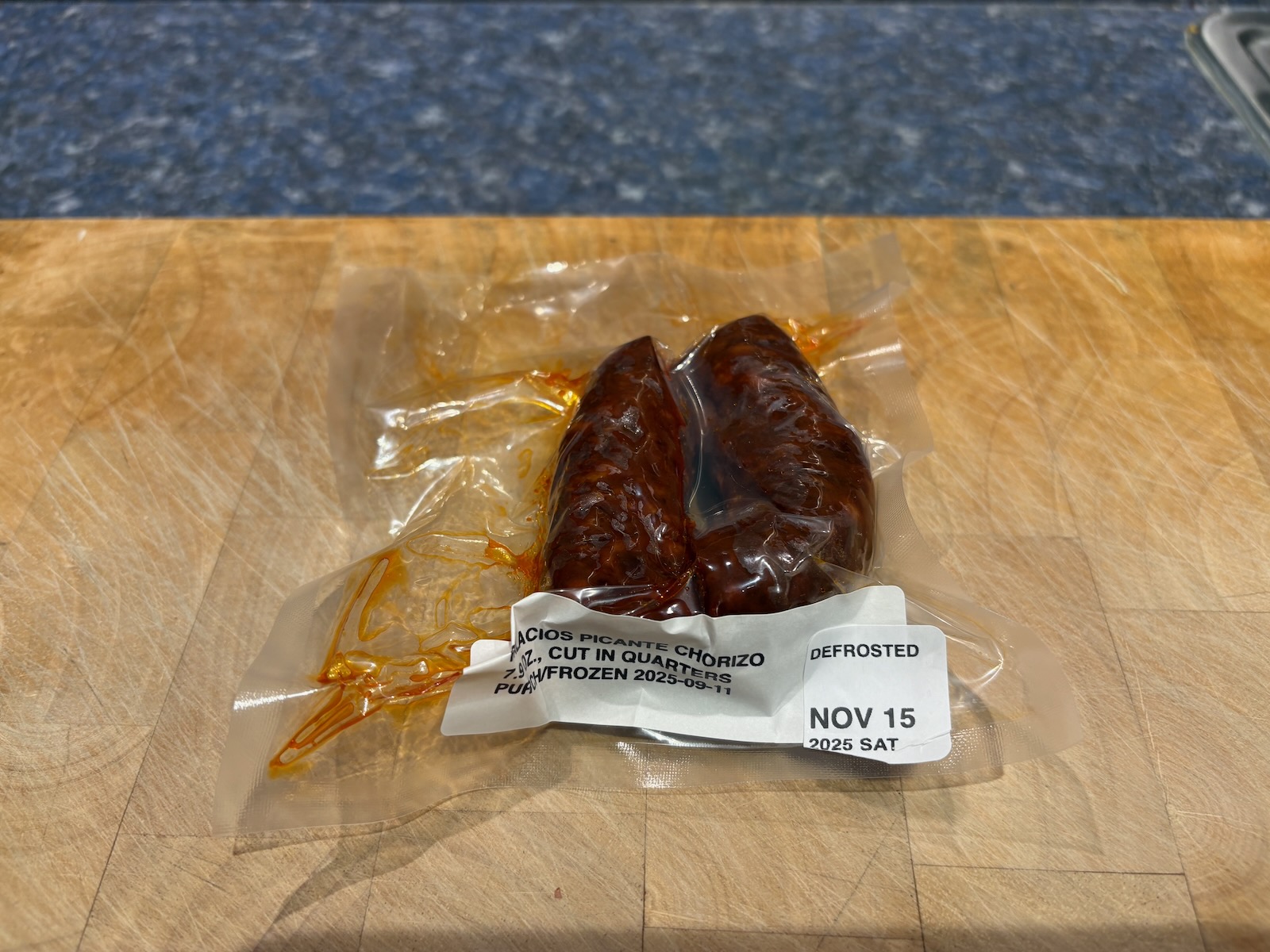 I normally use Palacios picante chorizo, which is excellent, but has also become very expensive. On November 15, 2024: $51.62. On May 7, 2025: $55.66. On November 15, 2025: $89.00!