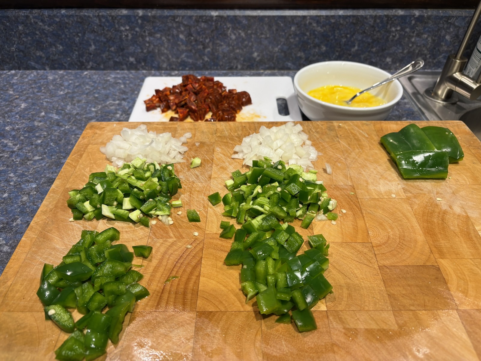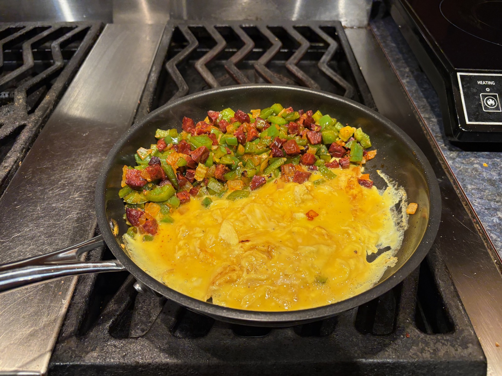 If I'm not making omelette filling, it's really the same amount of vegetables as usual, except all go into the chorizo burrito filling.