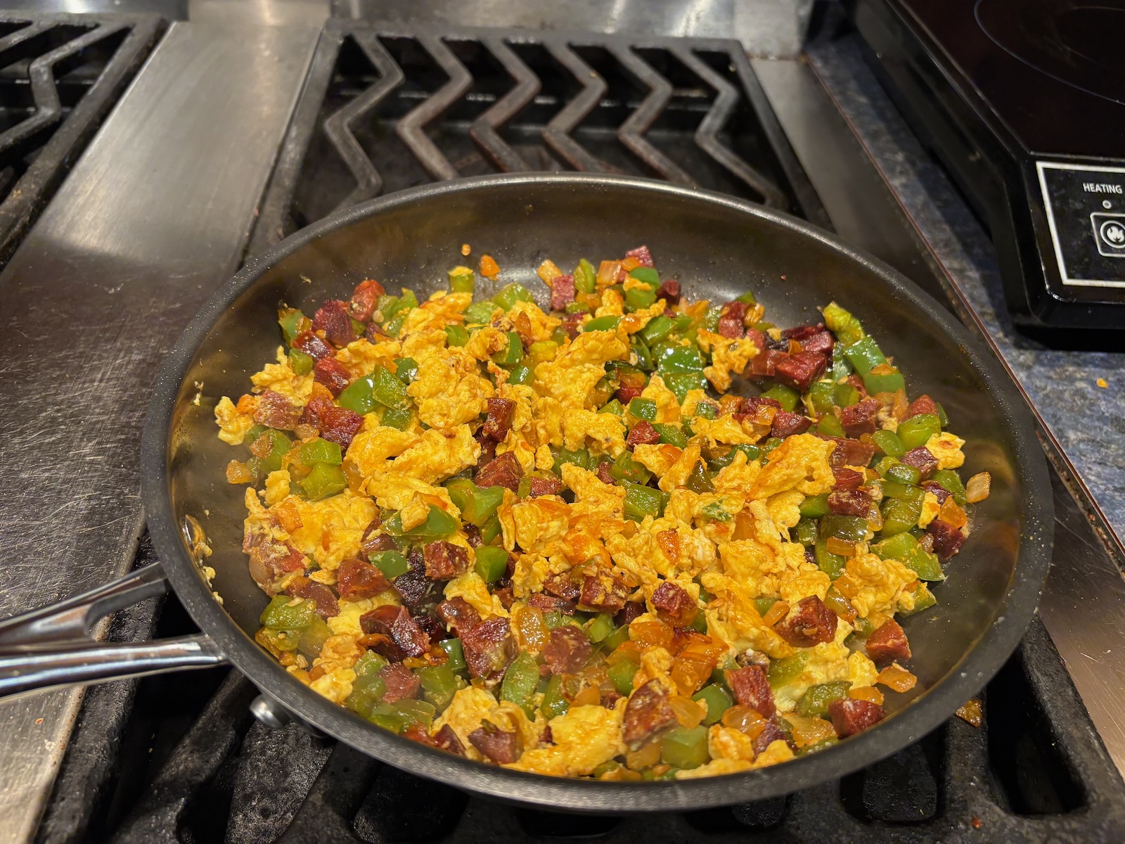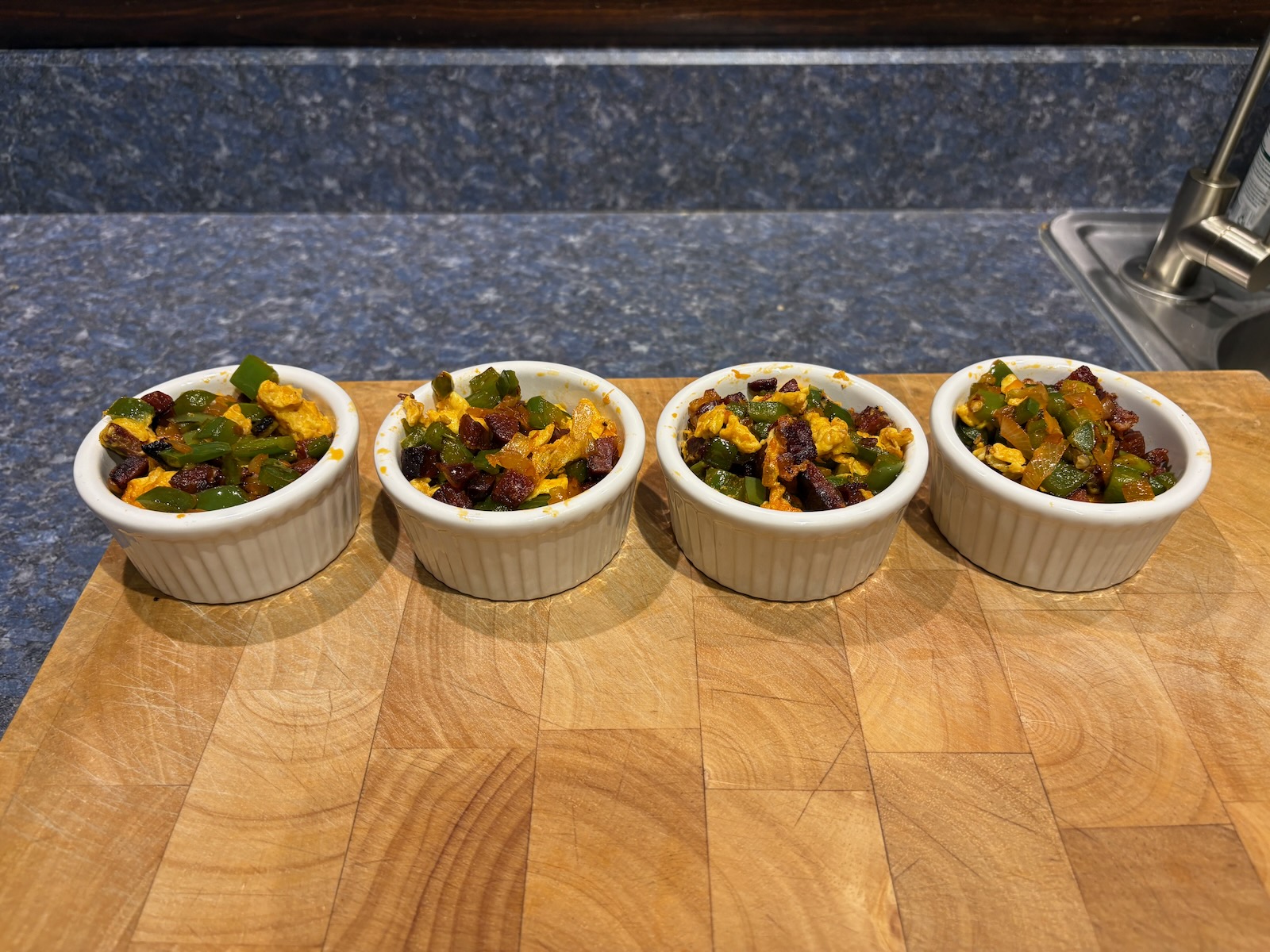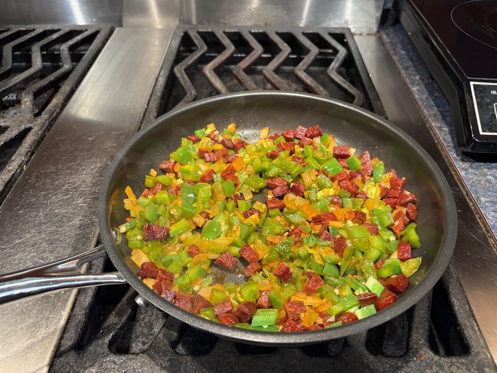 3.0 oz. chorizo sausage, diced onion, diced green pepper or red pepper, diced jalapeño, minced 1 egg, beaten