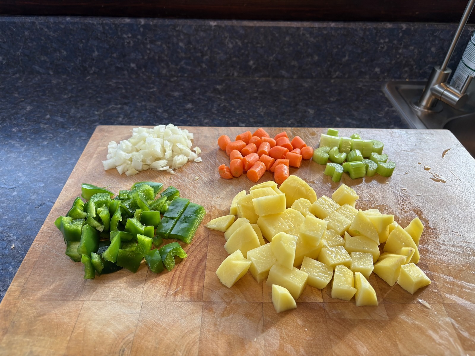 Yellow onion, carrot, celery, green pepper, and potato.