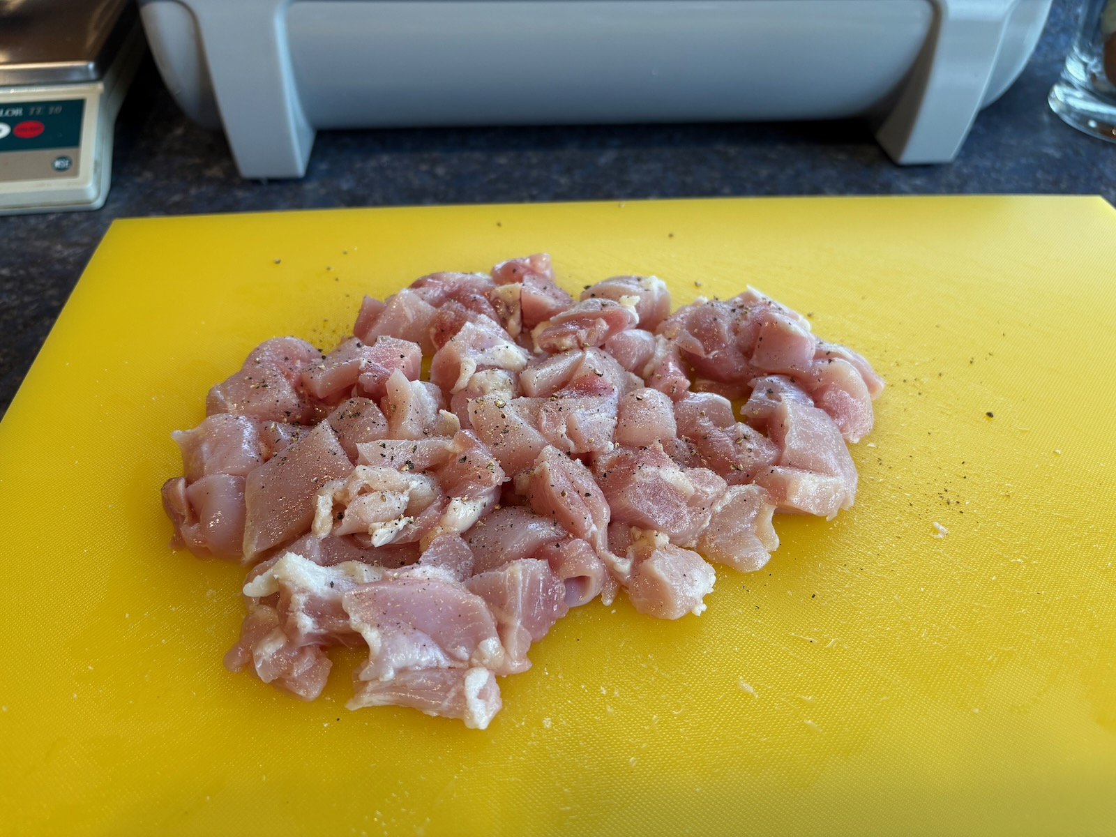 I previously trimmed out 12.0 oz. of leg and thigh meat, boneless, skinless, and diced. I cooked it in the sous vide, then froze it until I was ready to make a batch of curry.