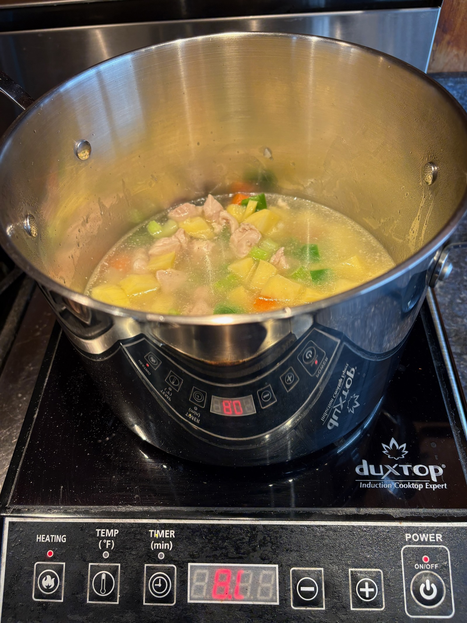 Add the potatoes, bring to a boil, then lower the heat (3.5 on my induction hotplate) and cook for 15 minutes.