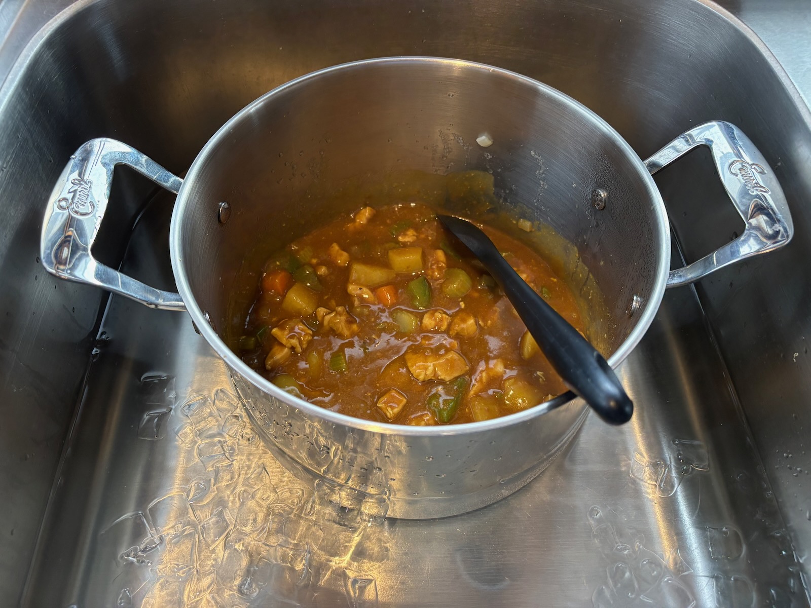 Chilling the pot in the sink in ice water.