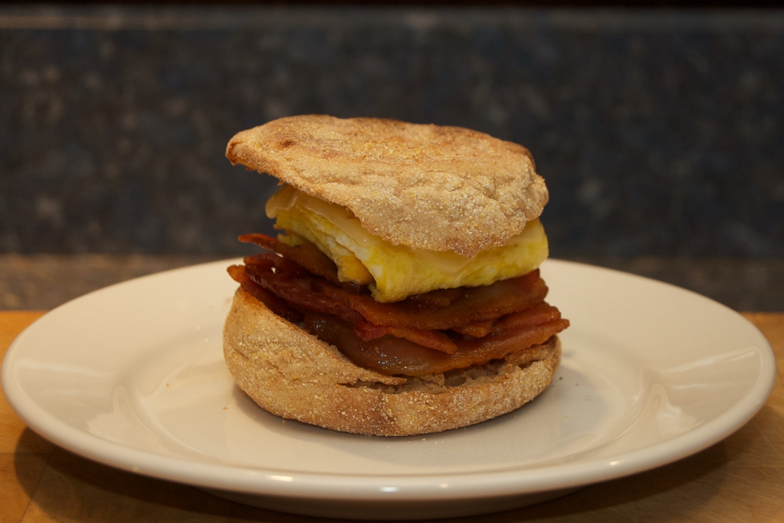 Breakfast: Bacon, egg and cheese English muffin . With 3 slices of bacon, an organic egg and Cabot extra sharp cheddar cheese on a Barowski's whole wheat English muffin.
