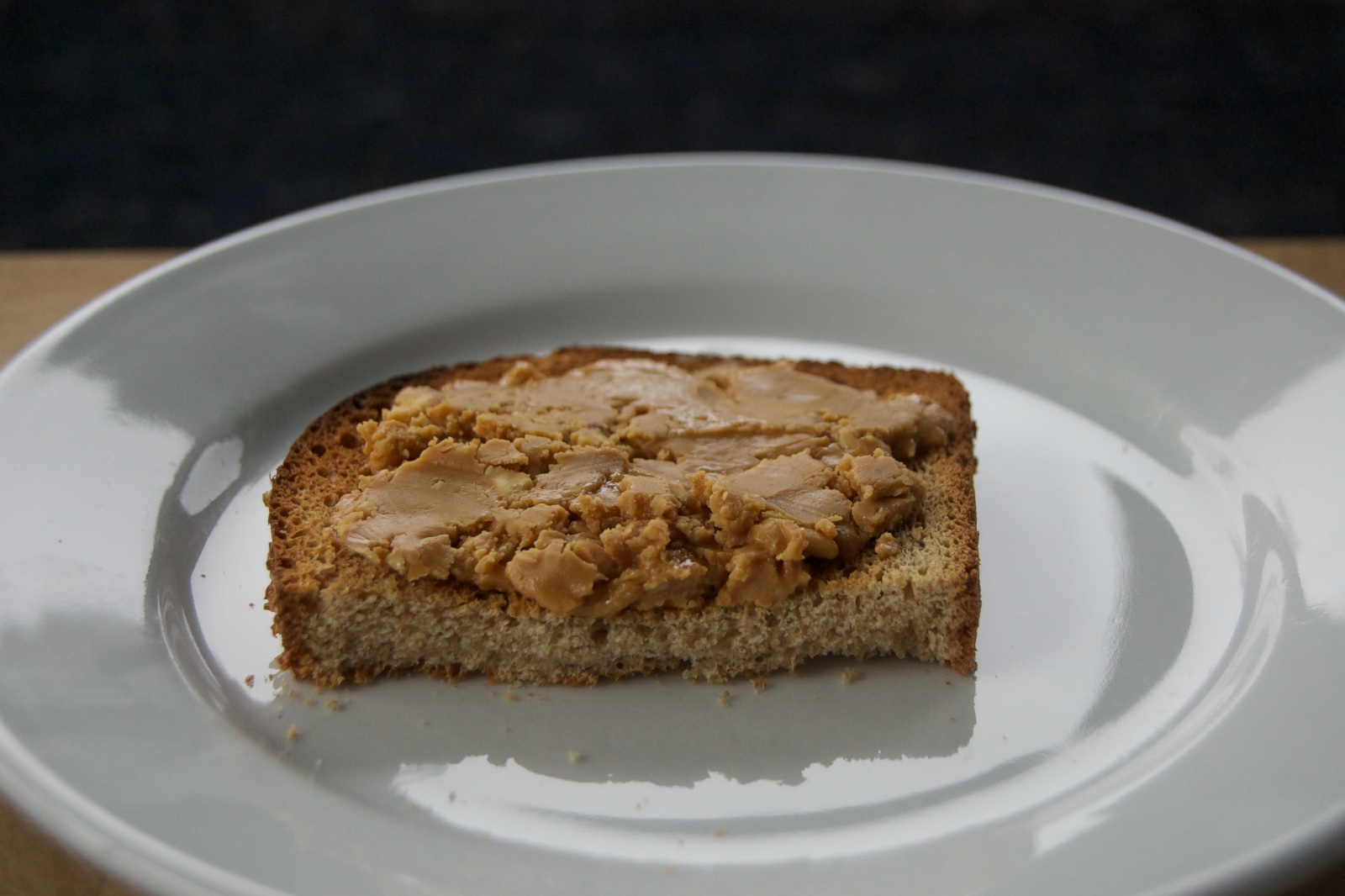 Post-breakfast: A half slice of Barowski's whole wheat toast with Woodstock Farms organic peanut butter.
