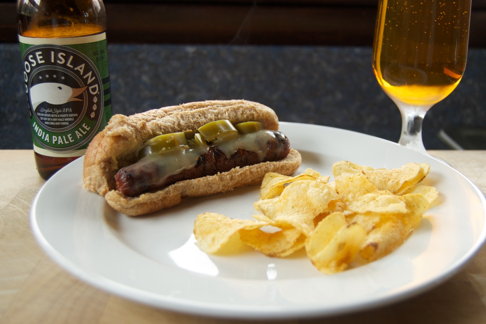 Lunch: Cheese hot dog with Kettle Chips hot jalapeƱo potato chips and a Goose Island IPA.