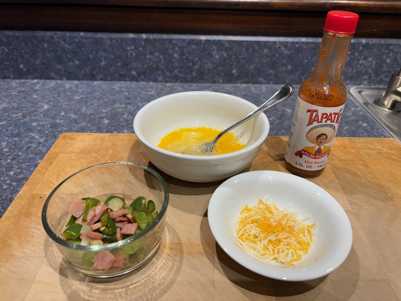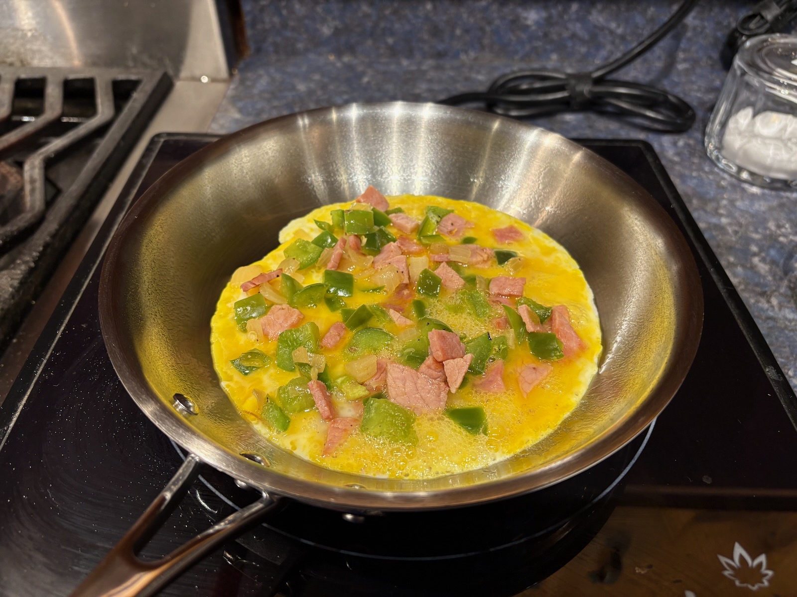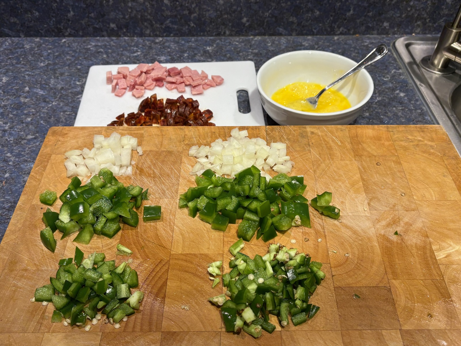 Here's the mise en place for one very full omelette. That's 2 oz. of diced baked ham, previously vacuum sealed and frozen.