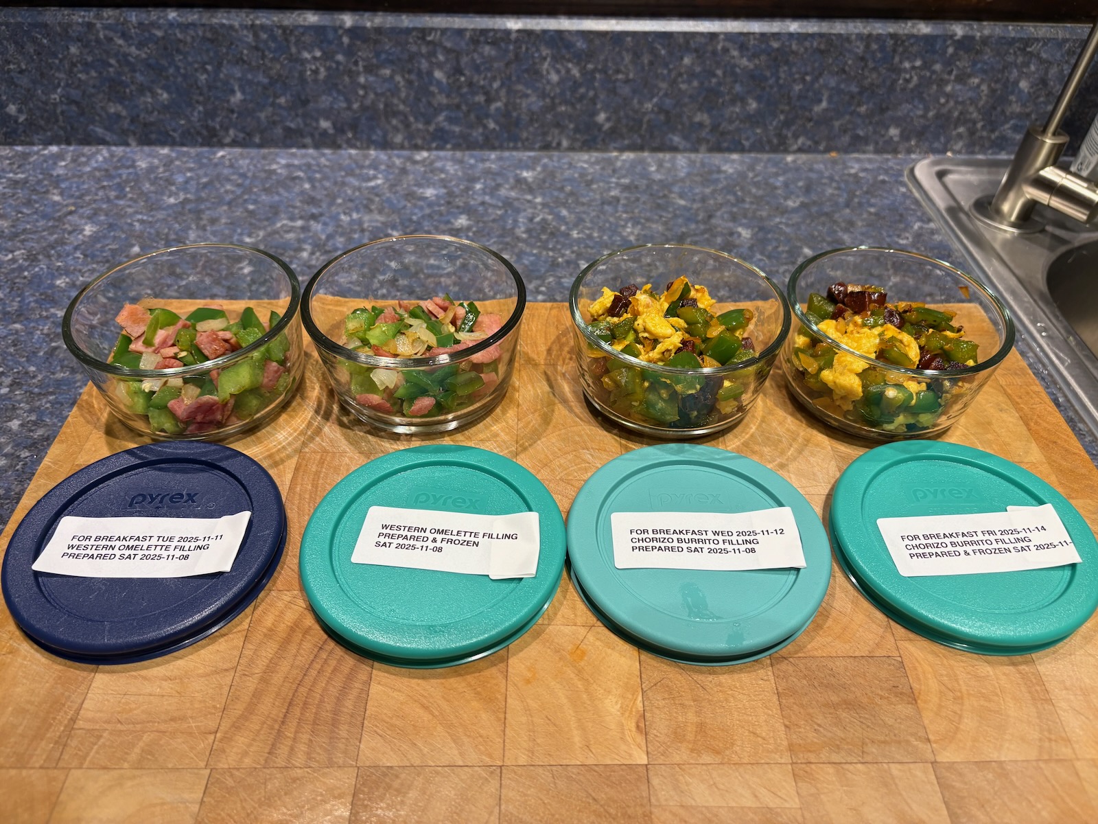 I split the spicy western omelette filling into two servings. There's 1.8 oz. of ham in it, and splitting it in half is roughly equivalent to the amount of meat in the chorizo breakfast burrito serving. I've noticed weight gain from Tuesday to Wednesday, and I think it's because of the very large size of Tuesday's breakfast. By splitting the filling in half it should fit in a one egg omelette, which is a better serving size and what I used to make a long time ago. The filling should freeze fine, because the vegetables are the same as chorizo breakfast burrito and I freeze one serving of that every week.