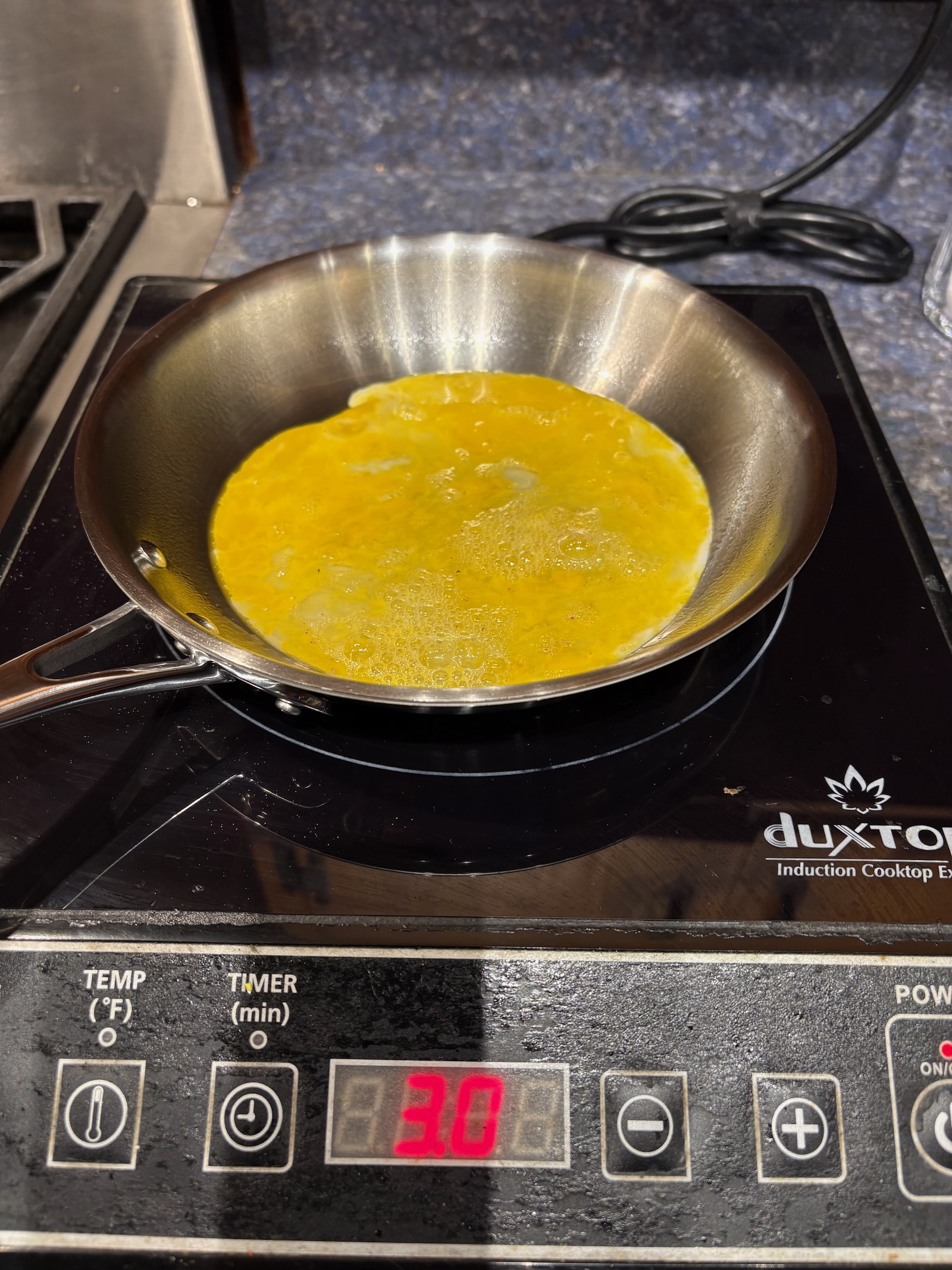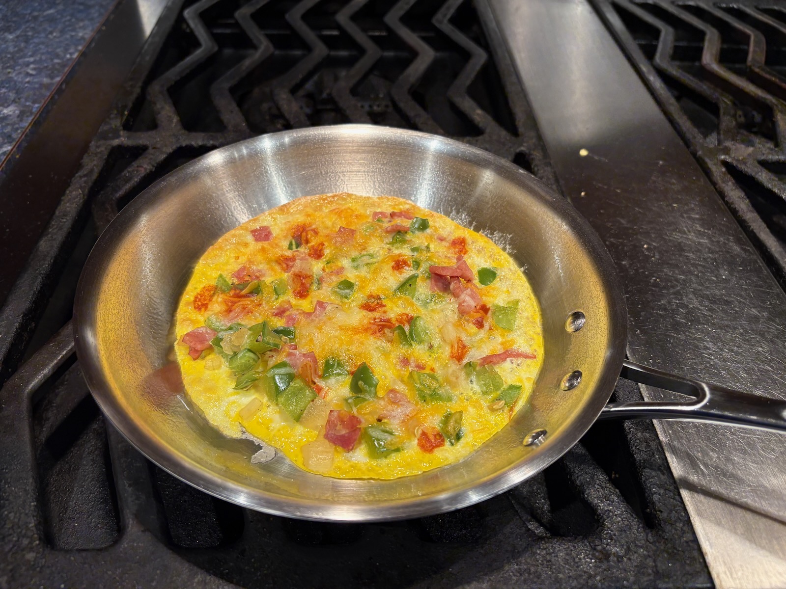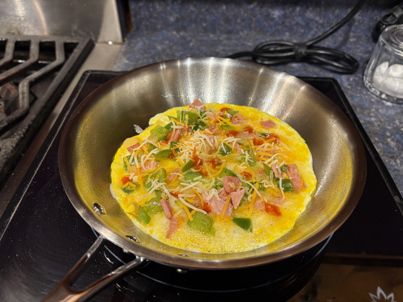 I also cooked it on the induction hot plate (on setting 4) until the egg just started to set up, added the filling and cheese, and transferred the pan to the broiler. This allowed the egg to cook completely and not brown the outside so much.
