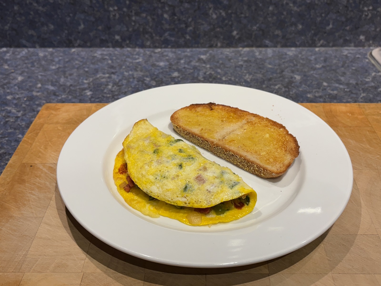 This was delicious. I like the hot pepper addition to the standard Western omelette . Served with a homemade buttermilk biscuit (previously frozen). Defrosted overnight, split, reheated in the toaster oven, then buttered.