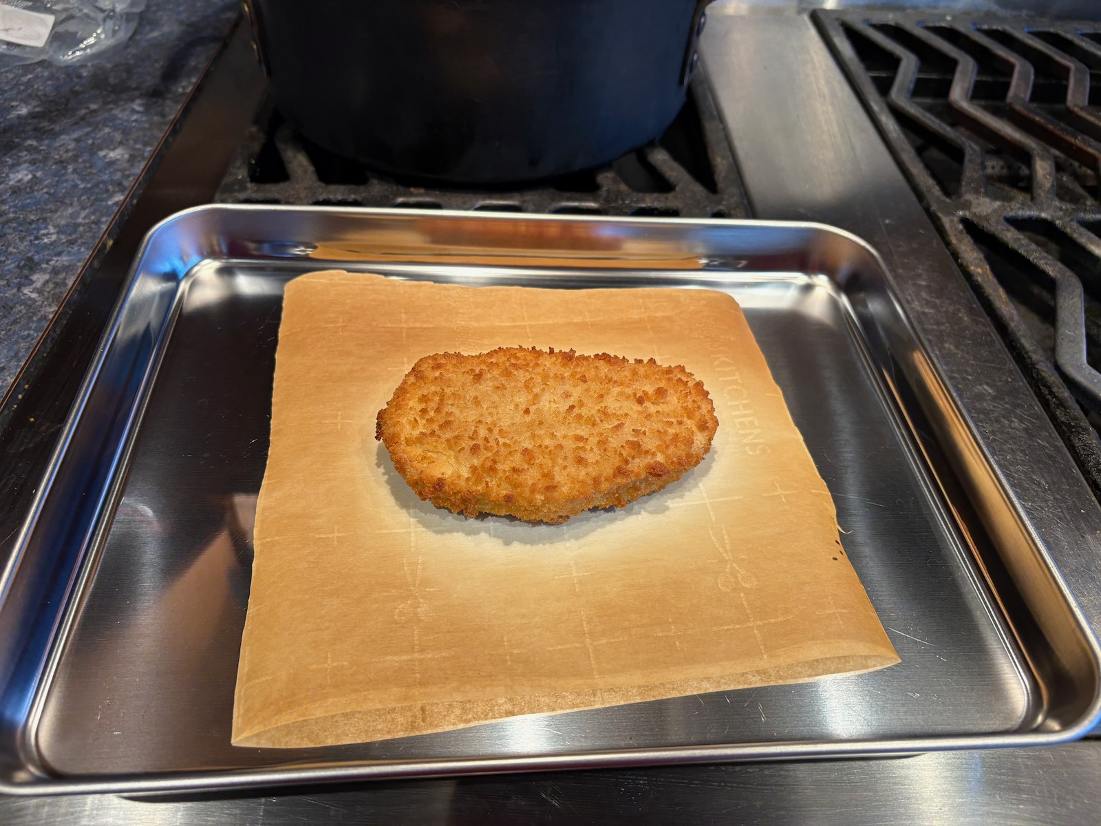 - 20:00 Veggie cutlet to oven on a sheet pan with parchment paper (or foil)