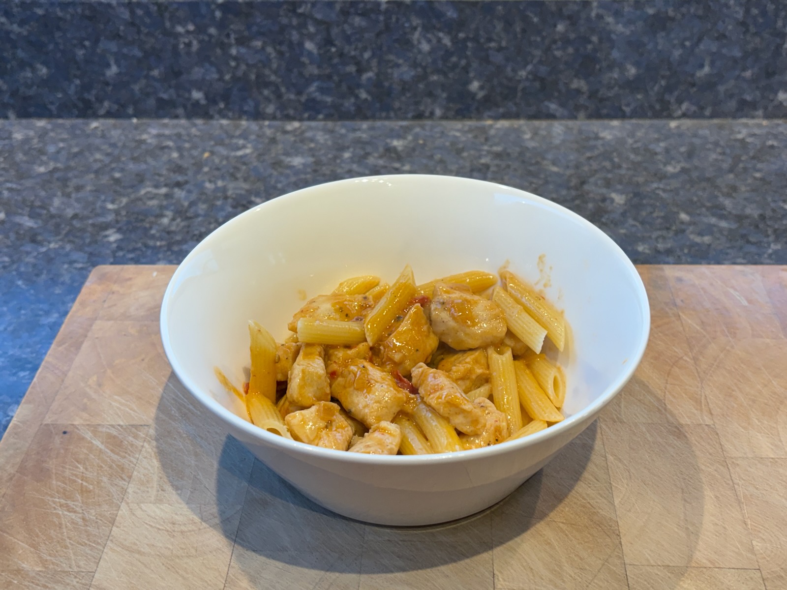 This time I served it with 1.5 oz. penne pasta, and diced the chicken, and it was really good. I'll make it this way in the future.