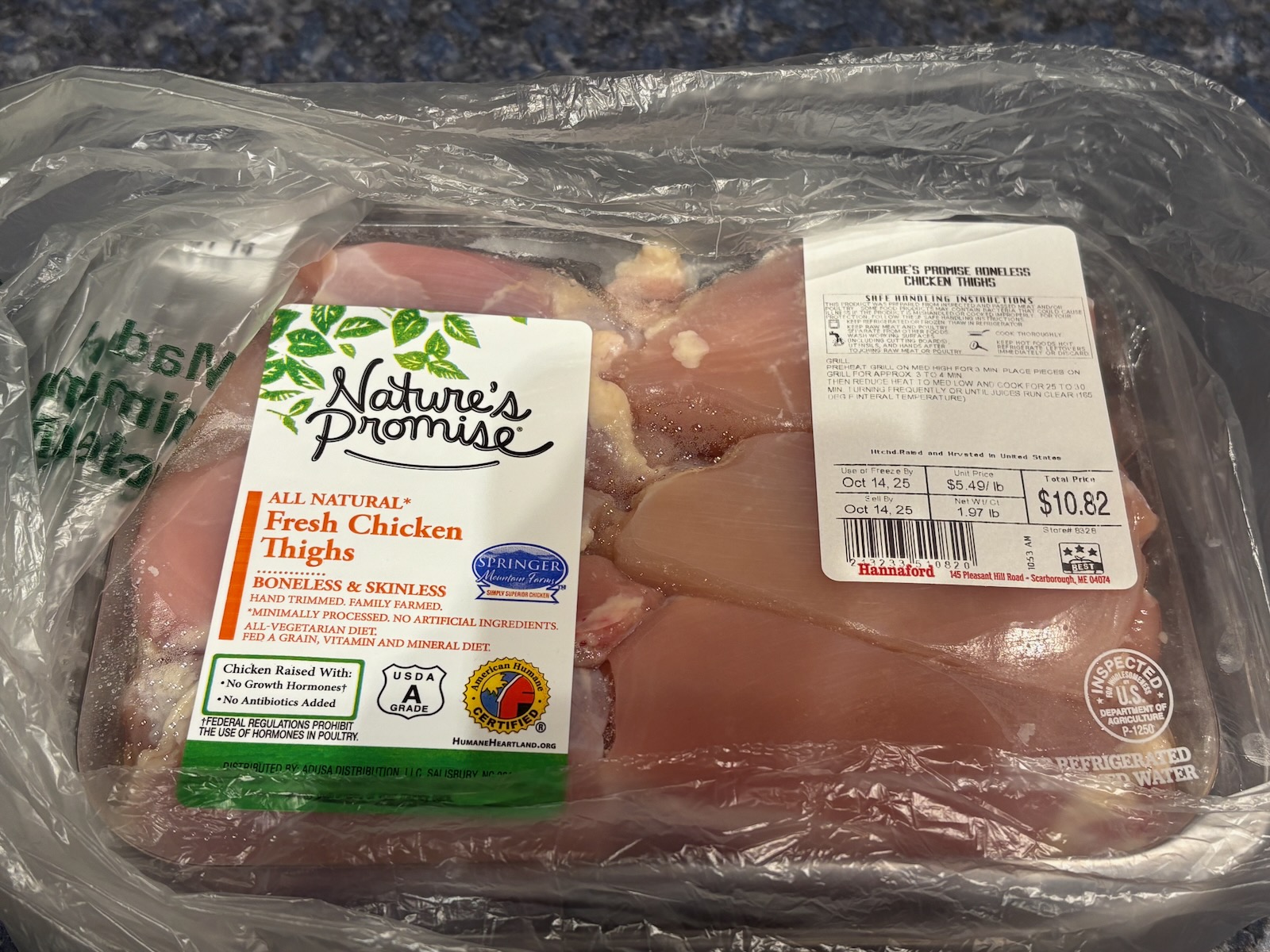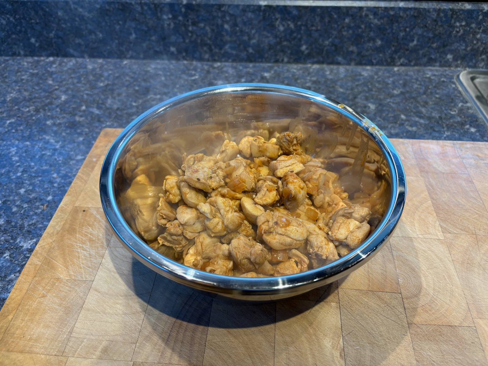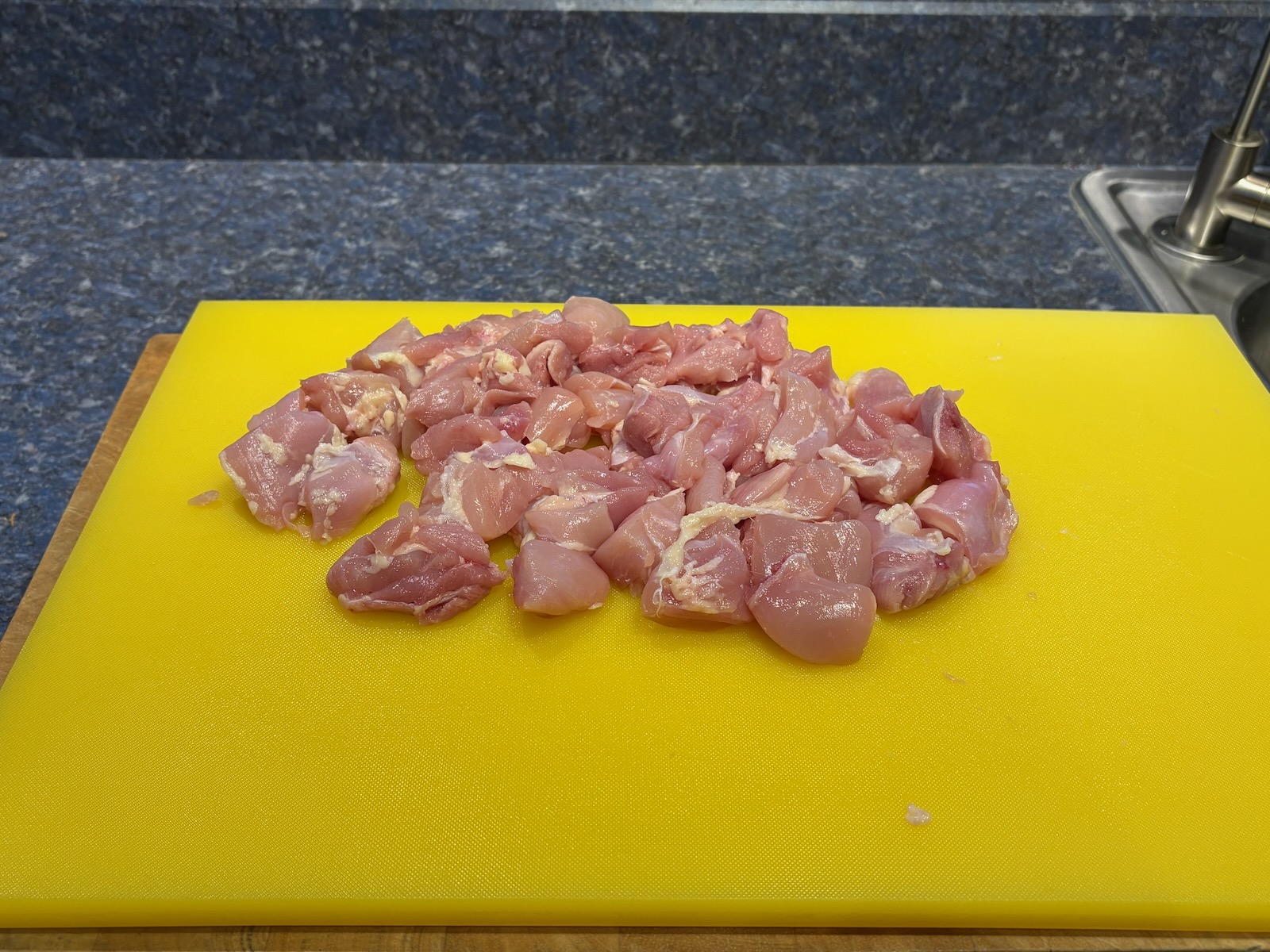 I used boneless, skinless chicken thighs. I previously used breast or breast tenders, but I like the thighs better. Season with salt and freshly ground pepper.