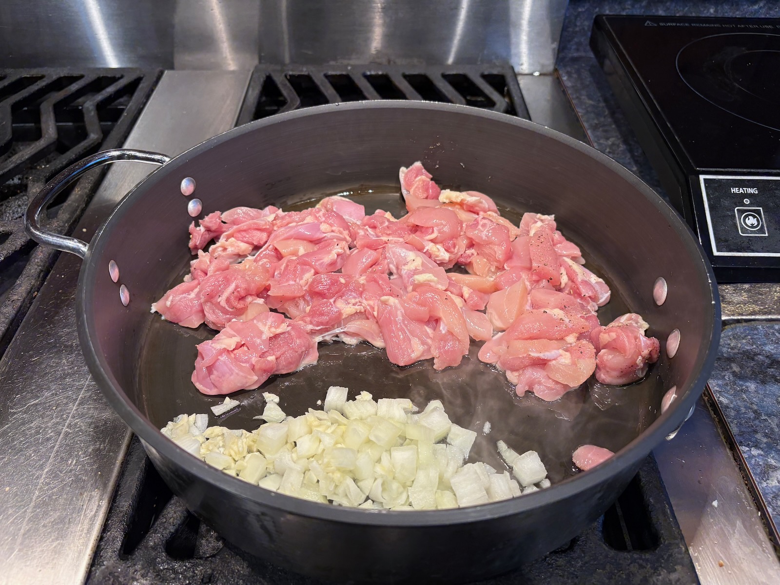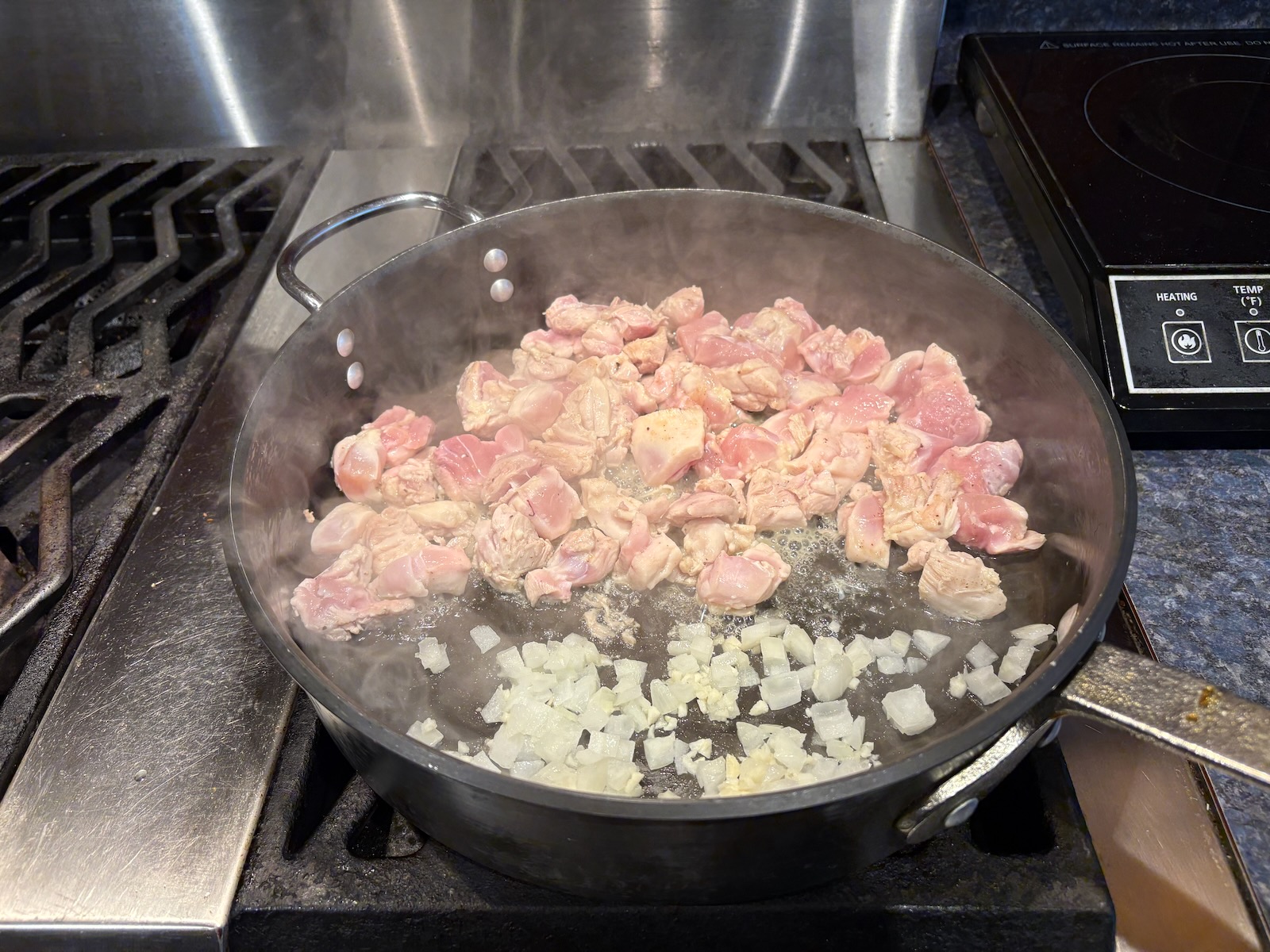 Cooked in the large sauté pan. Start the chicken browning and add the onions and garlic several minutes later.