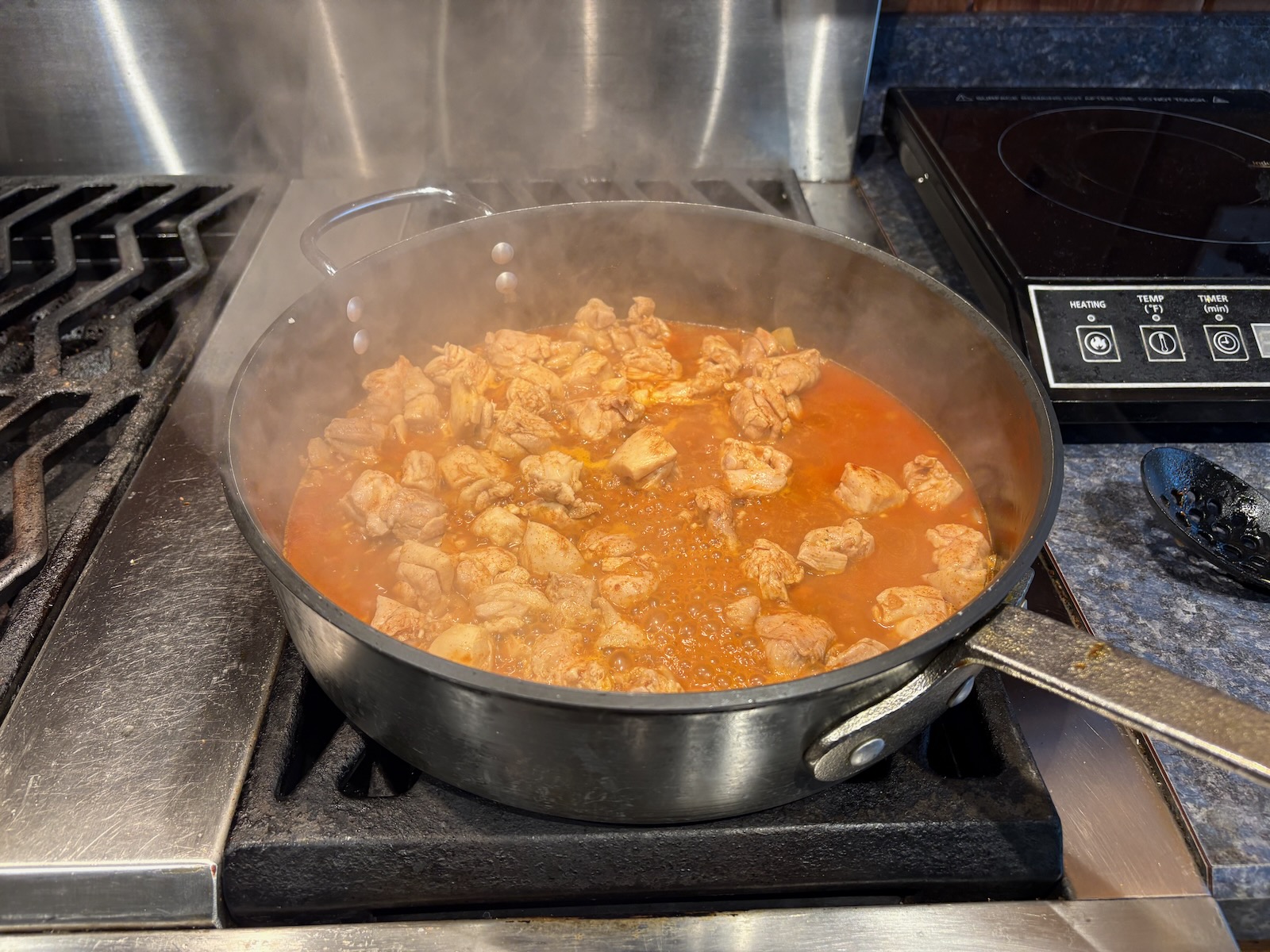 Add the paprika and chicken broth and cook until the chicken is done, several minutes.