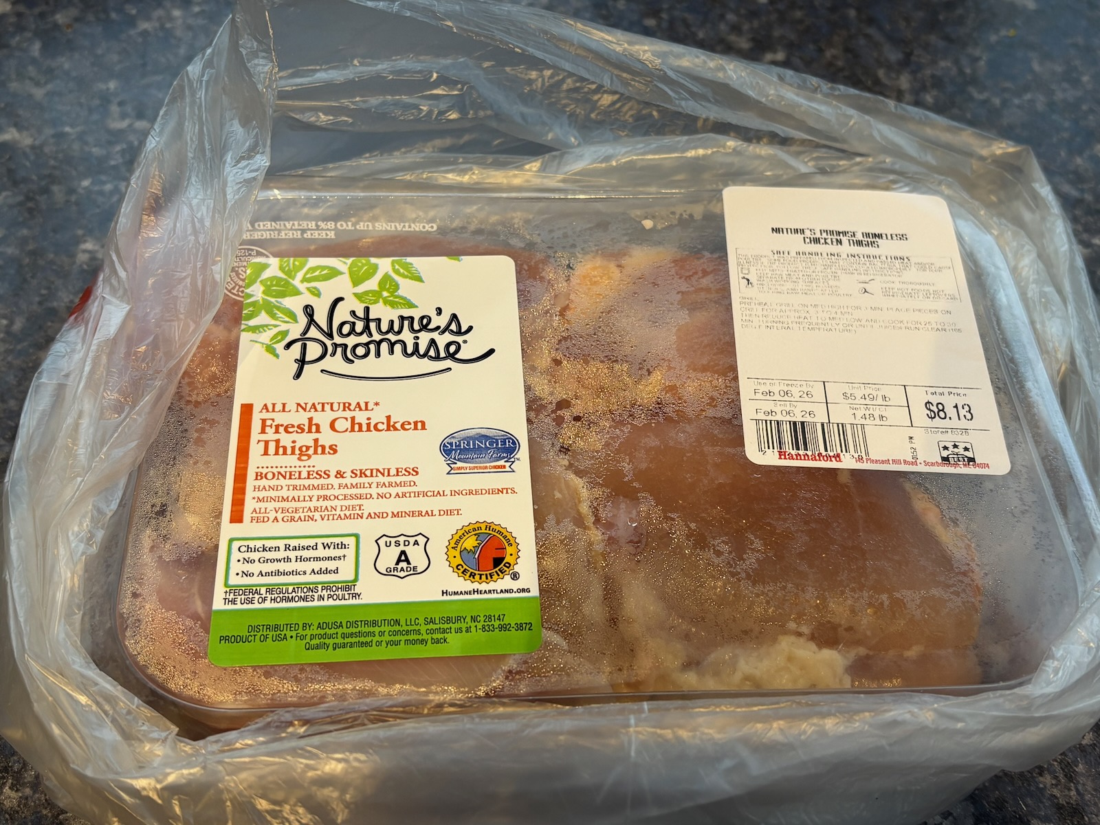 Started with a 1.48 lb. (23.7 oz.) package of boneless, skinless chicken thighs.