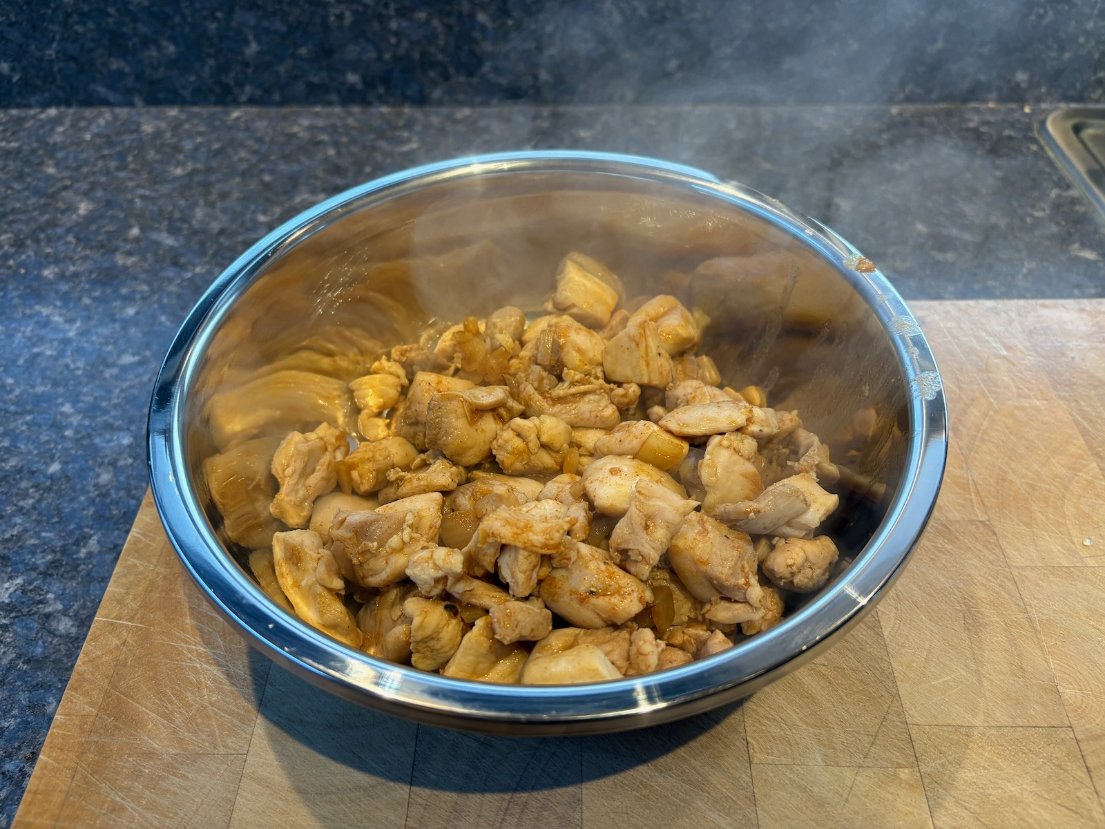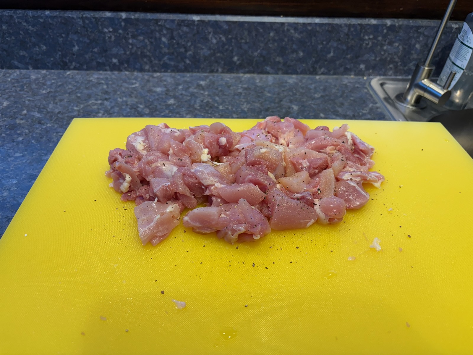 Diced the chicken. Seasoned with salt, pepper, and garlic powder.