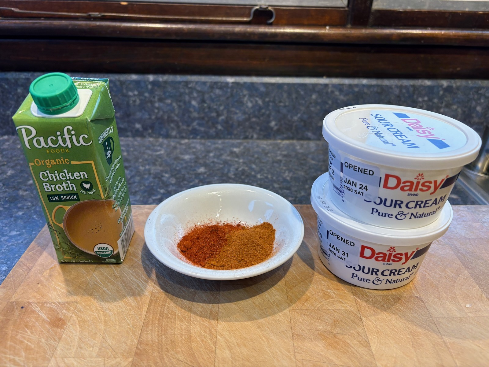 8 oz. chicken broth, 8 oz. sour cream, sweet, and hot Hungarian paprika.