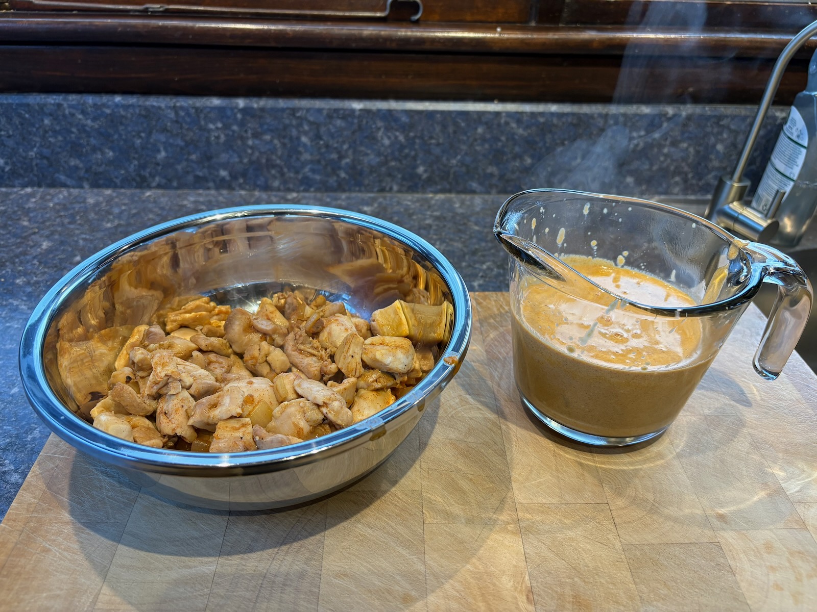 Chicken done. There was about 17.7 oz. of cooked chicken, enough to make 4 servings of 4.2 oz. each.