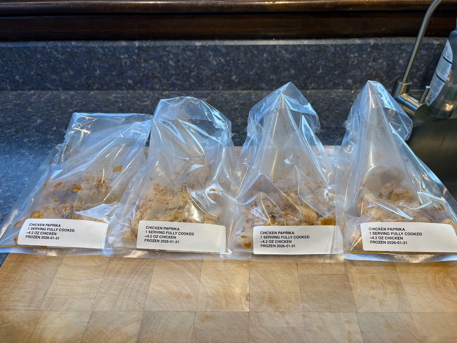 Divide the chicken in to 4 vacuum sealer bags. It should be about 3.8 to 4.1 oz. of chicken in each.
