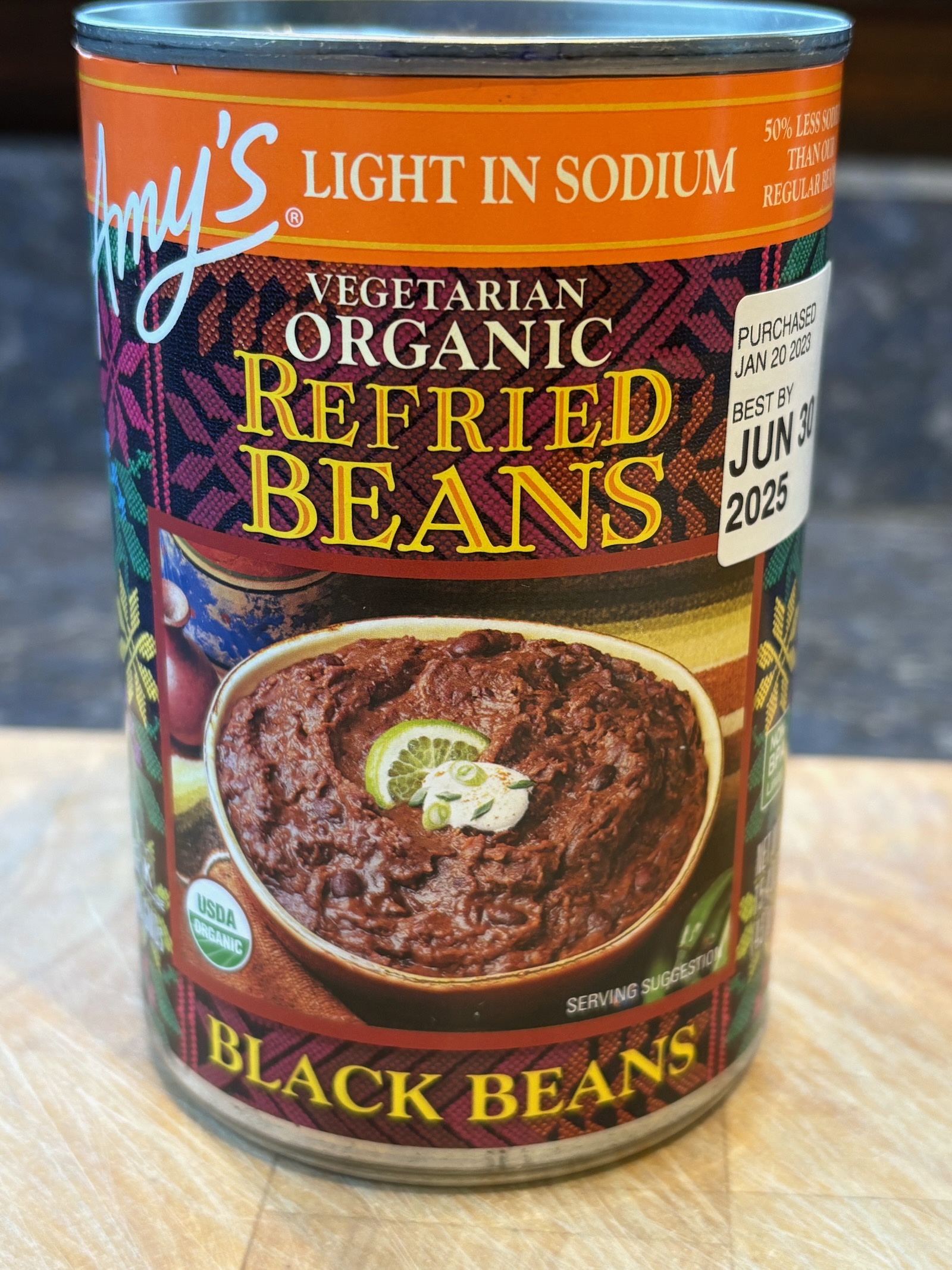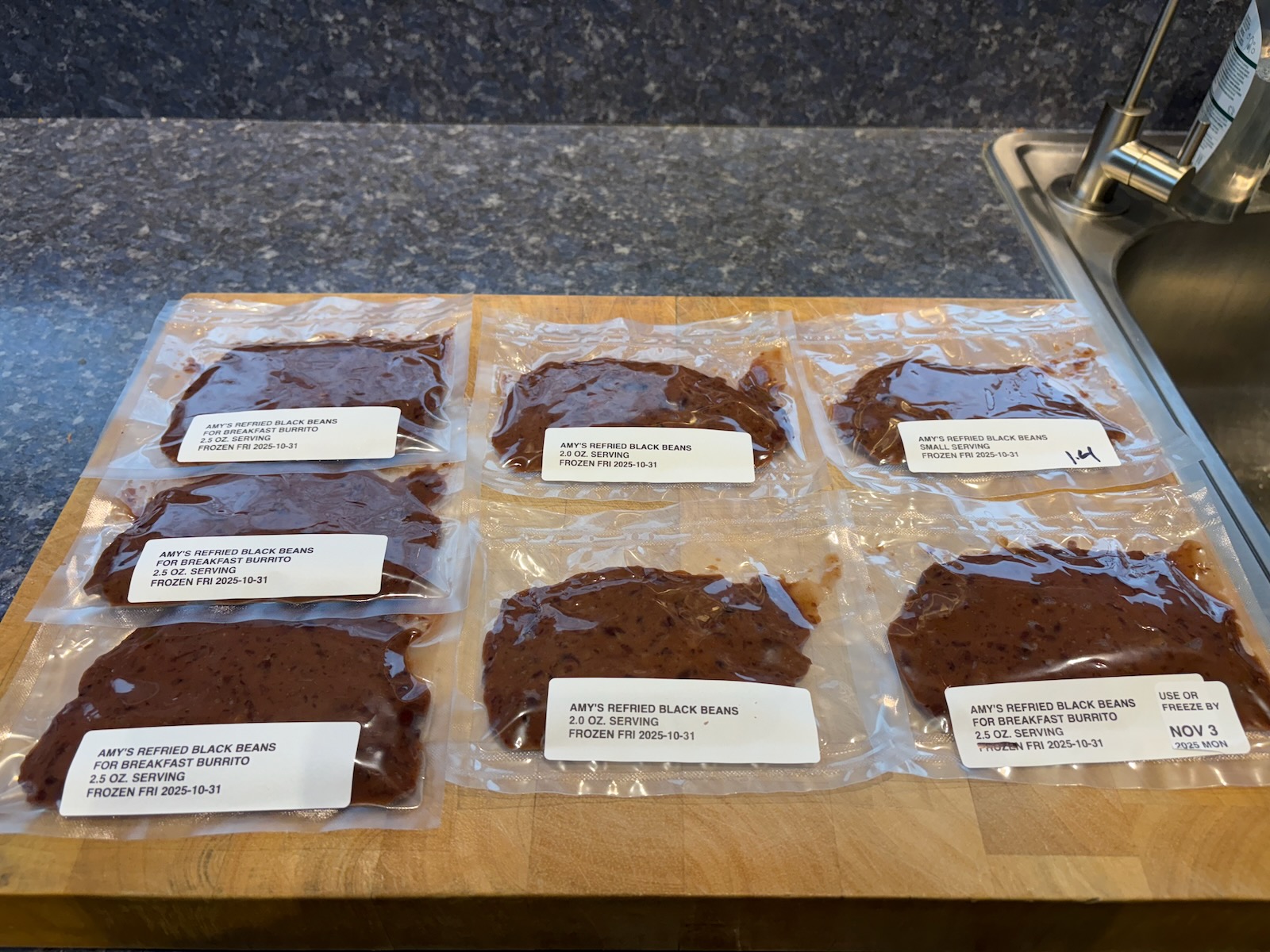 Earlier, I divided a 15.4 oz. can of refried black beans, vacuum sealed and froze individual packages.