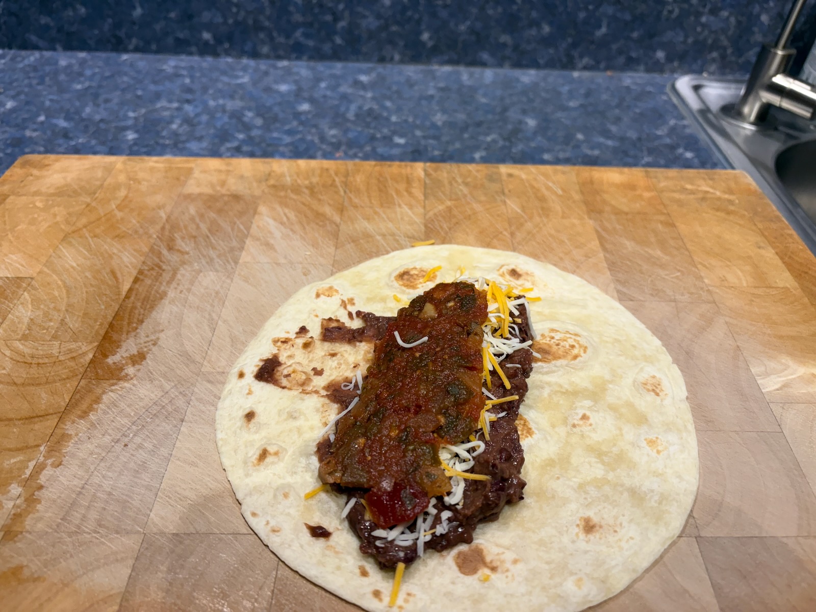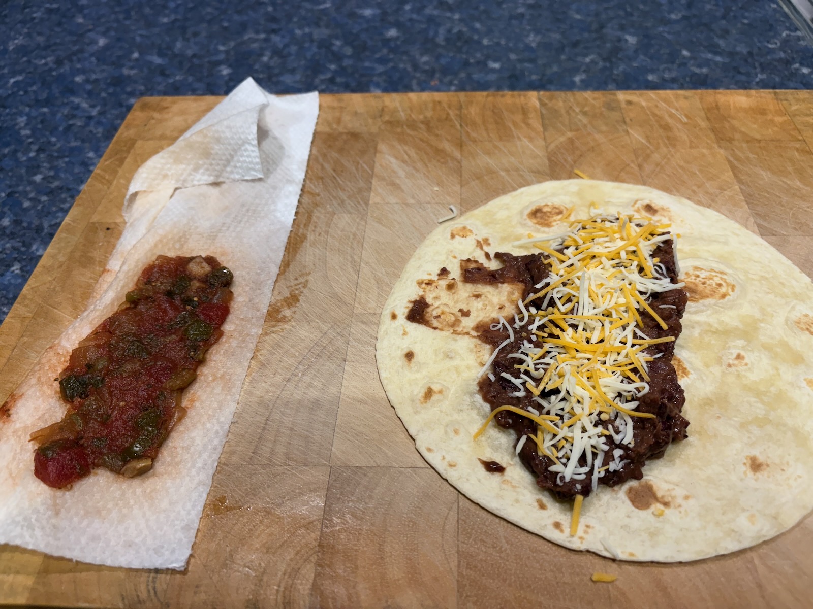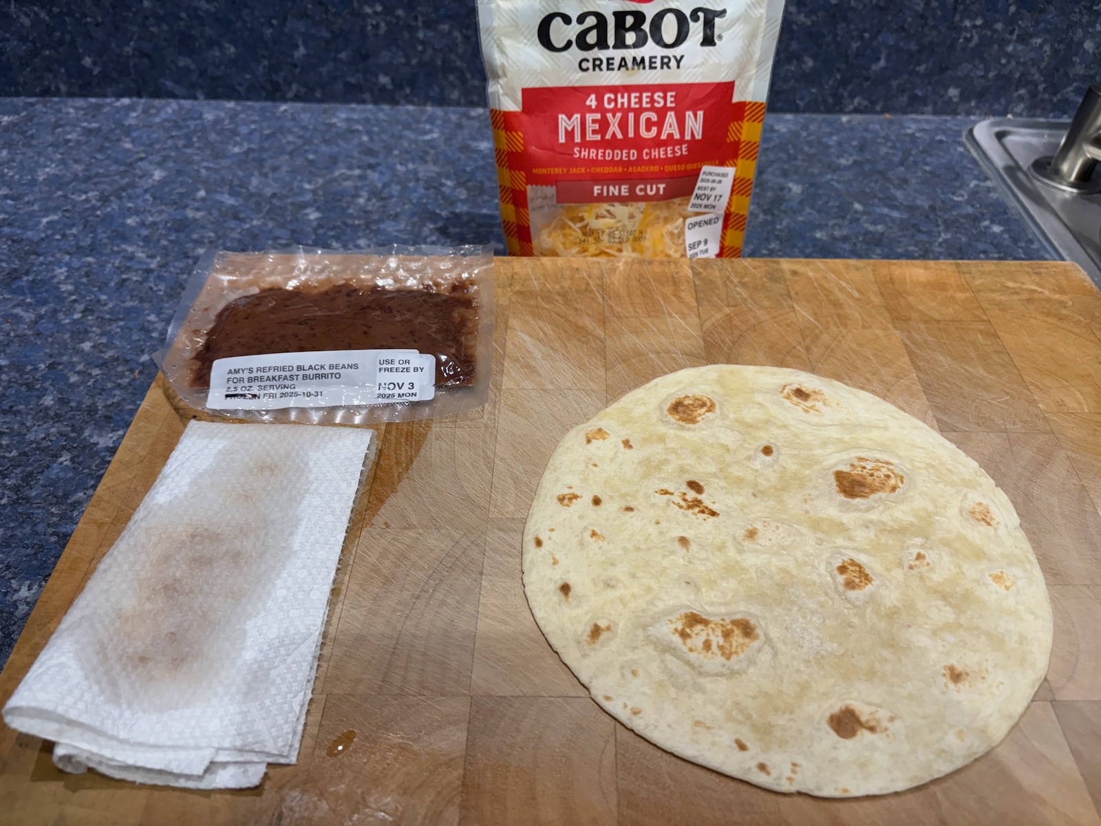 Warm the black beans either by putting the vacuum sealed bag in hot water, or in the microwave. Add the beans and cheese to the warm tortilla.