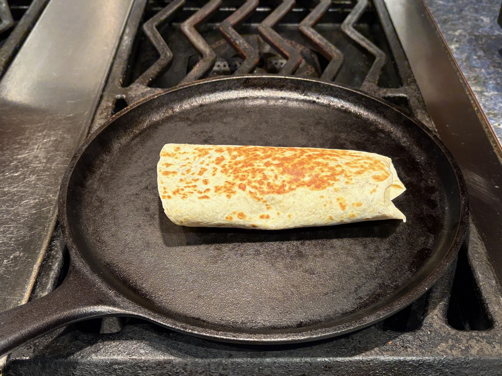 Cook the burrito on the griddle pan for a few minutes on each side.