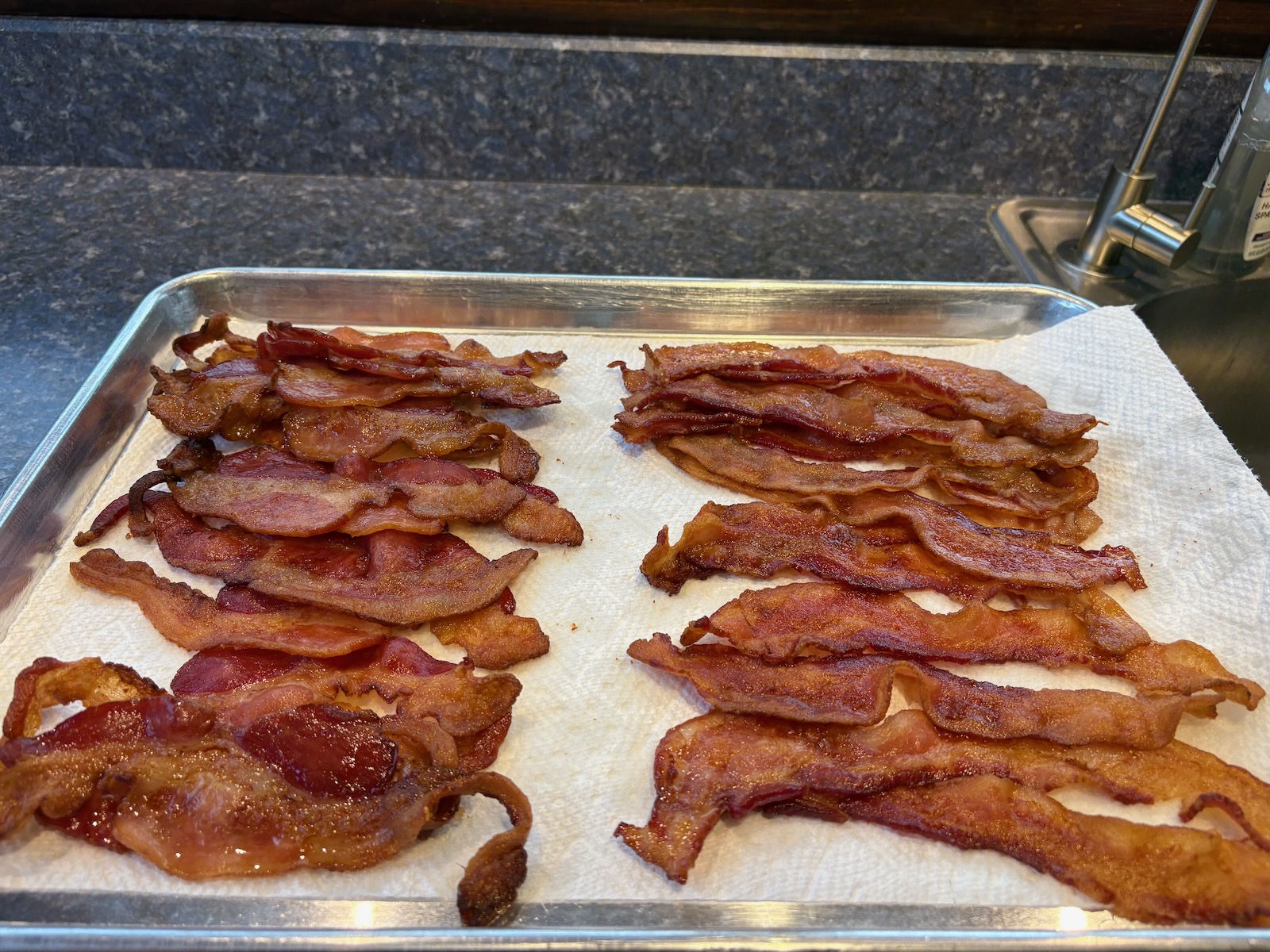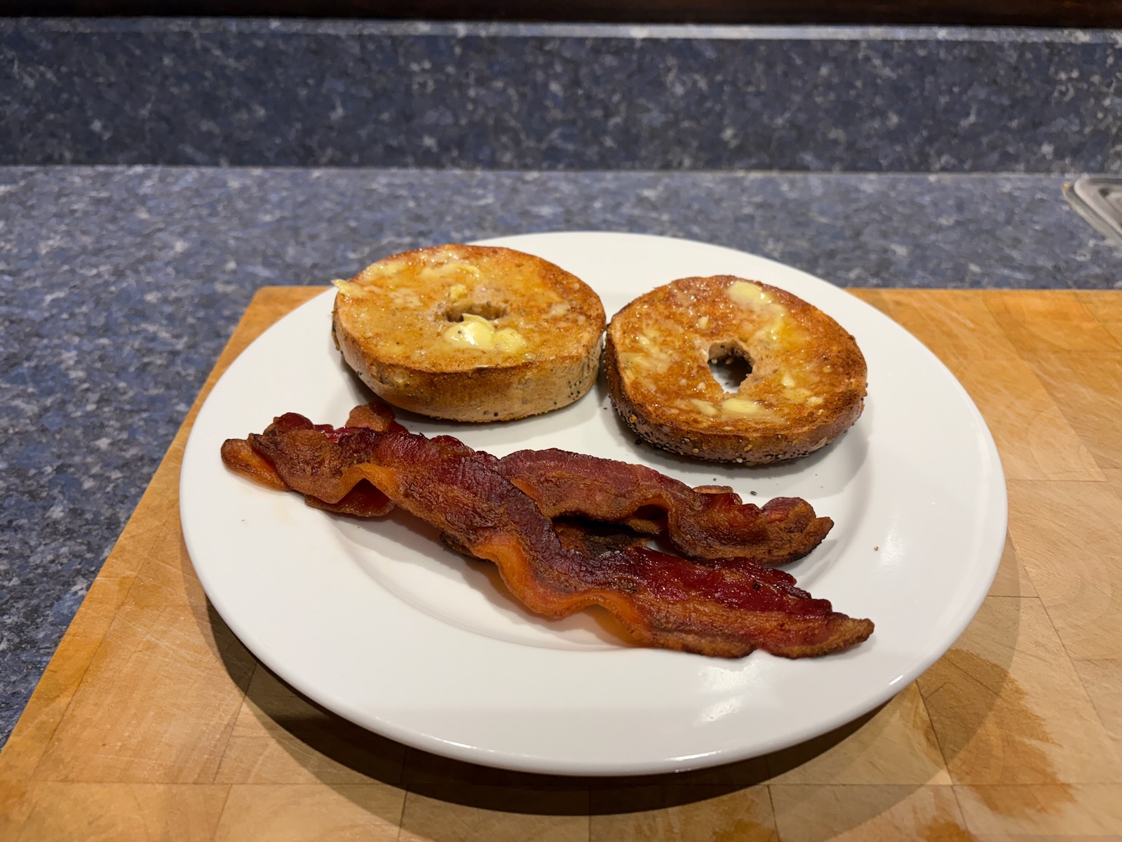 Breakfast: Toasted everything bagel with butter. Side of bacon.