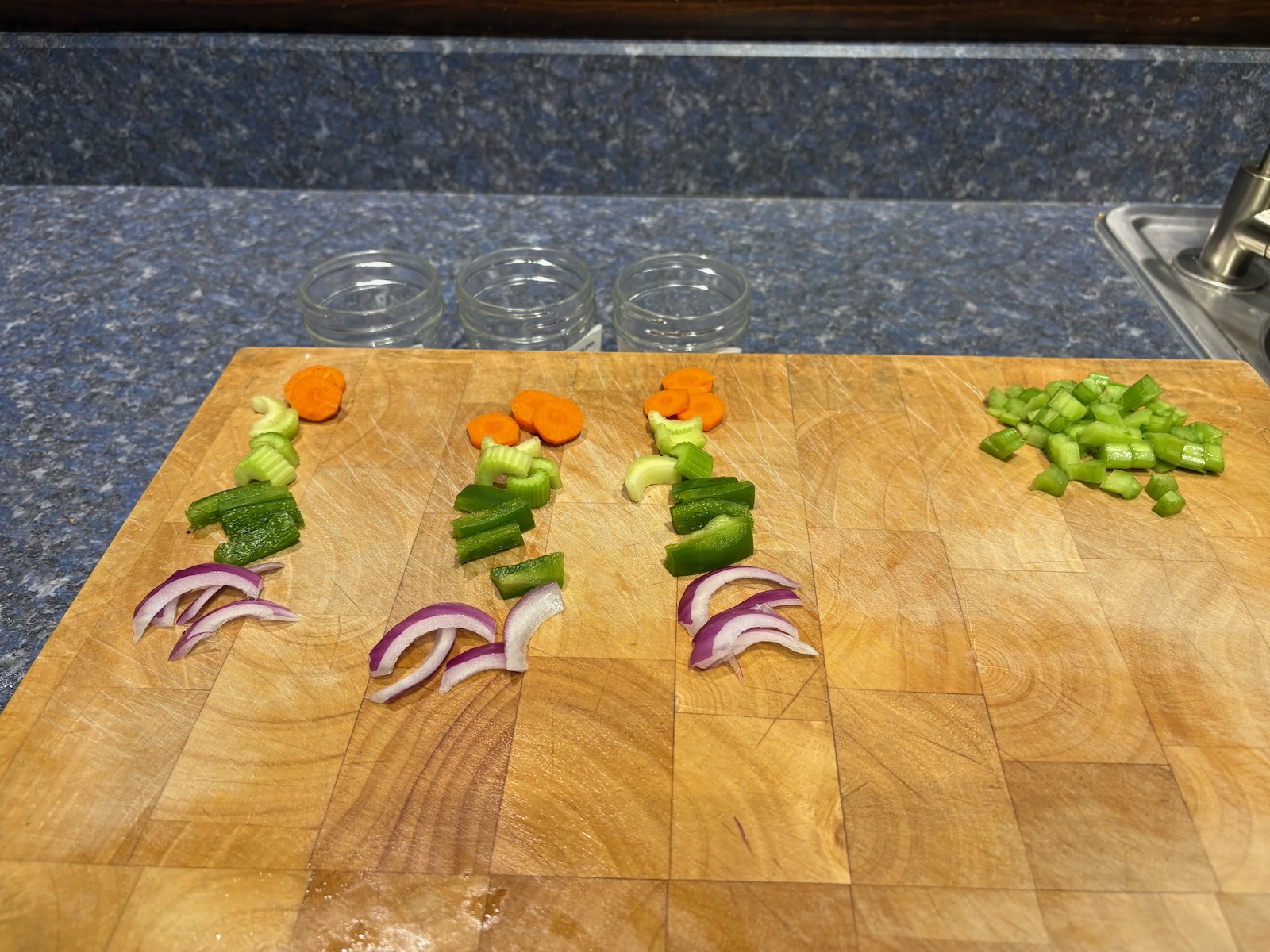 Prepped salad veggies. With carrot, celery, green pepper, red onion.