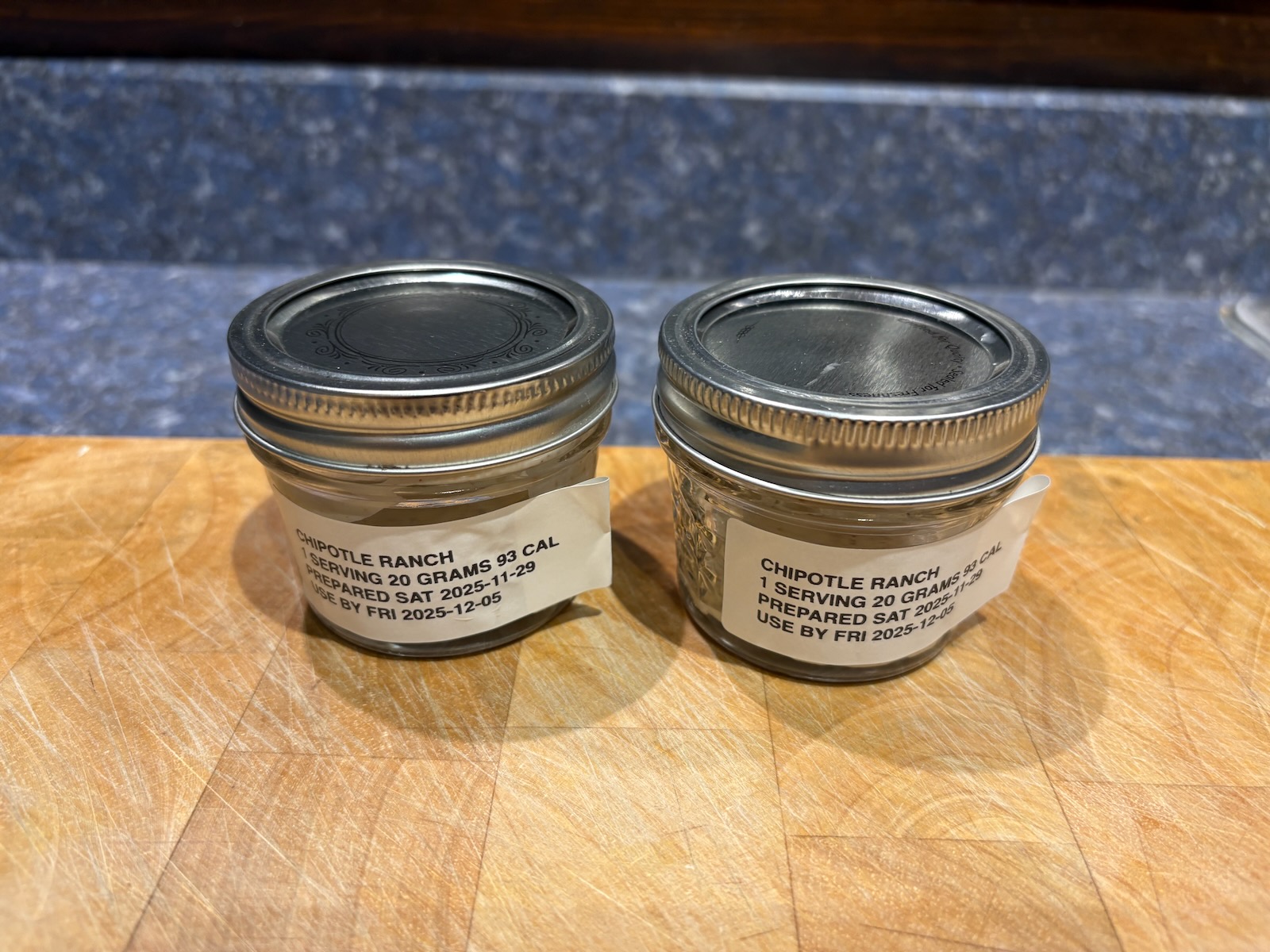 Prepped 2 servings of chipotle ranch salad dressing, 20 grams, 93 calories each.
