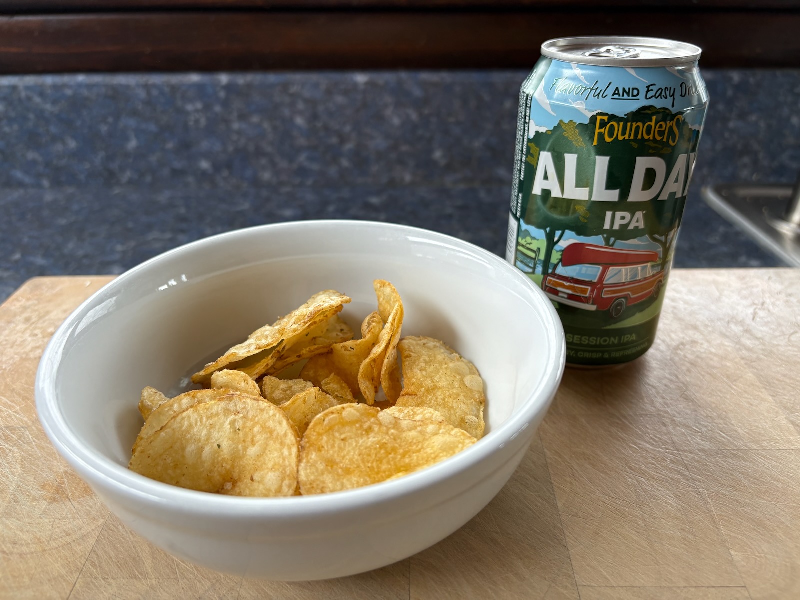 Snack: 2.0 oz. Kettle Chips hot jalapeño potato chips (300 cal). Founders all-day IPA. (Twice the amount pictured.)
