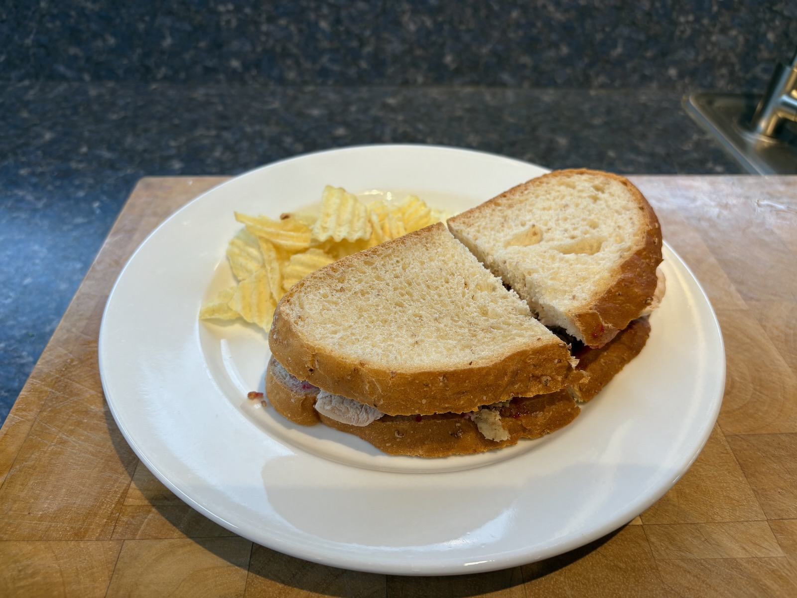 Dinner: Turkey gobbler sandwich with 2.5 oz. turkey. Potato chips. Half glass of Bota Box sauvignon blanc.
