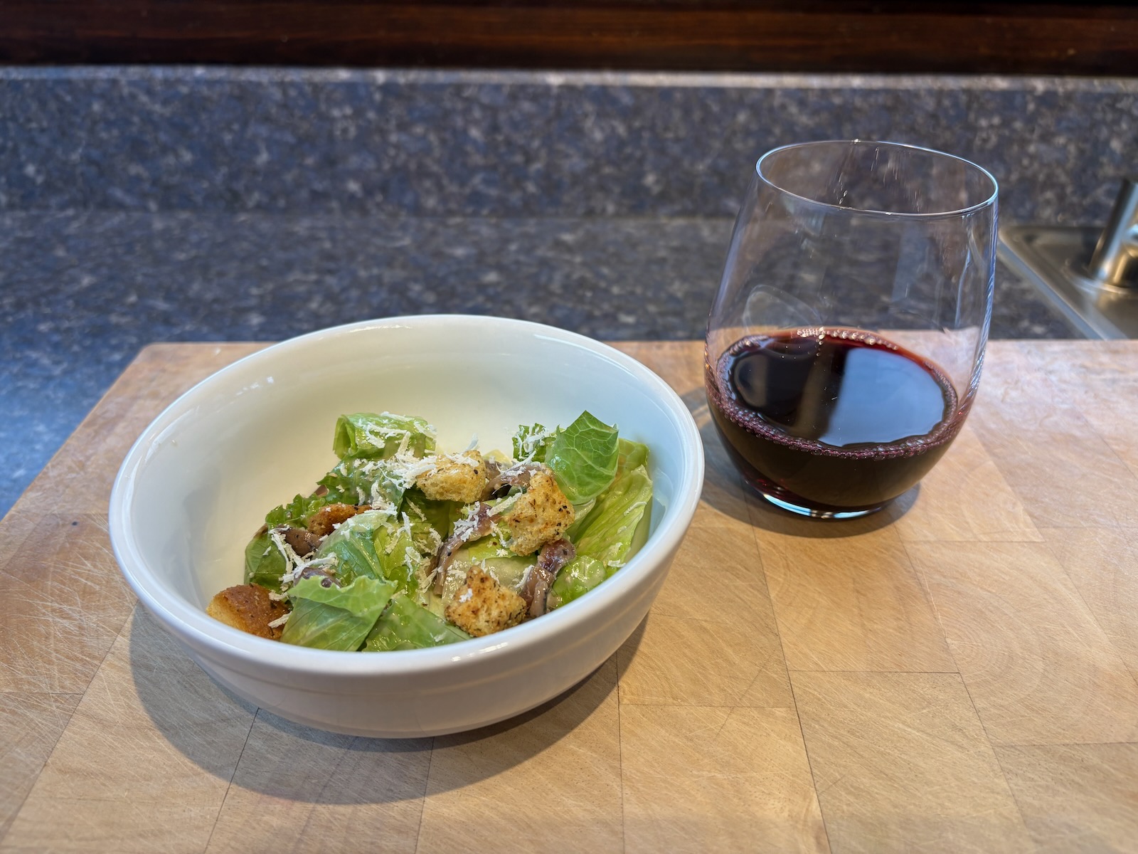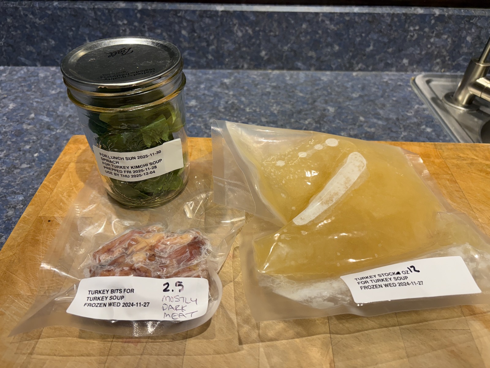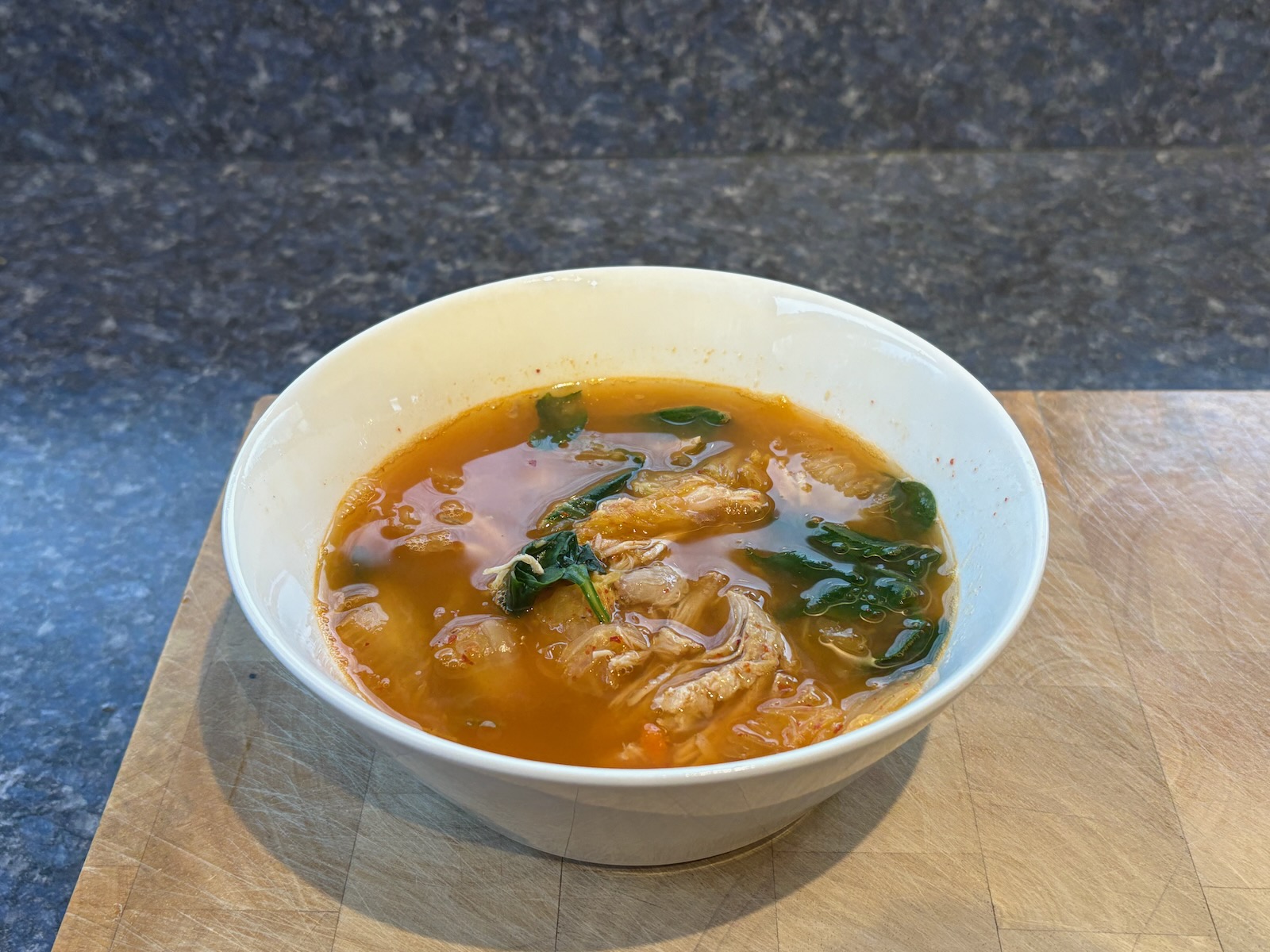 Lunch: Turkey kimchi soup. With 12 oz. turkey stock, 2.0 oz. turkey, kimchi, and spinach. A half glass of Bota Box sauvignon blanc.