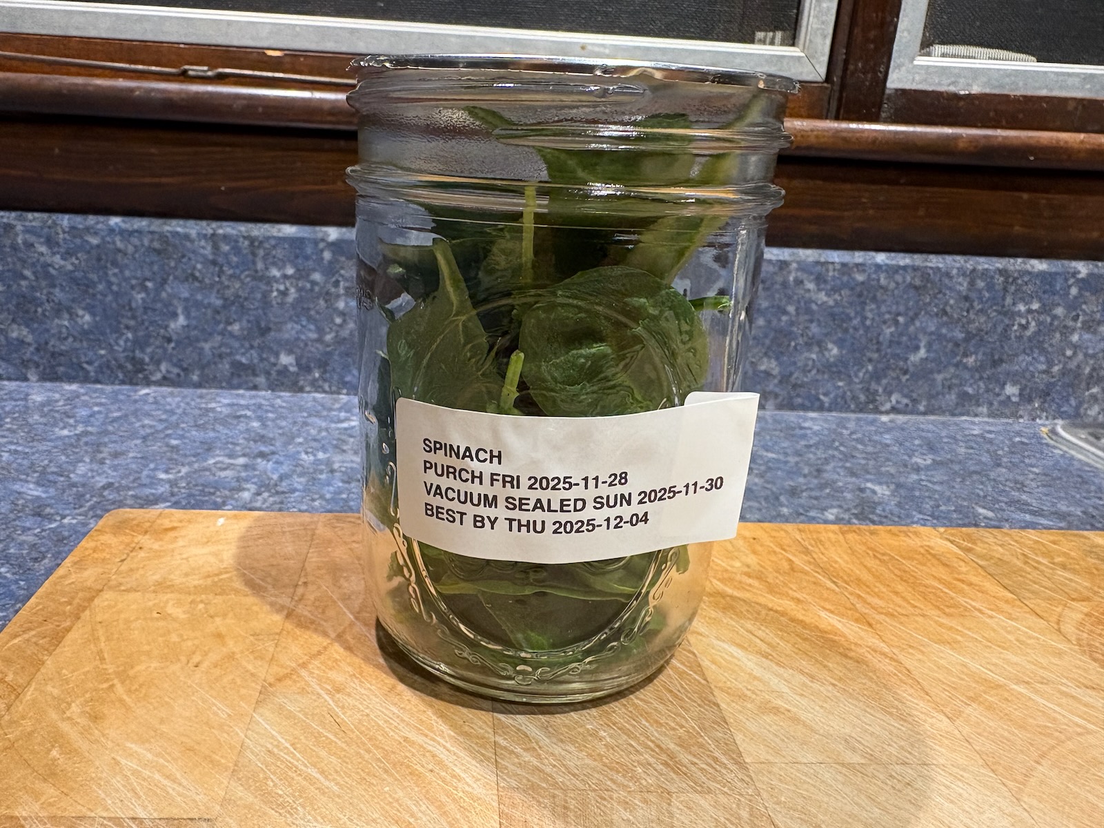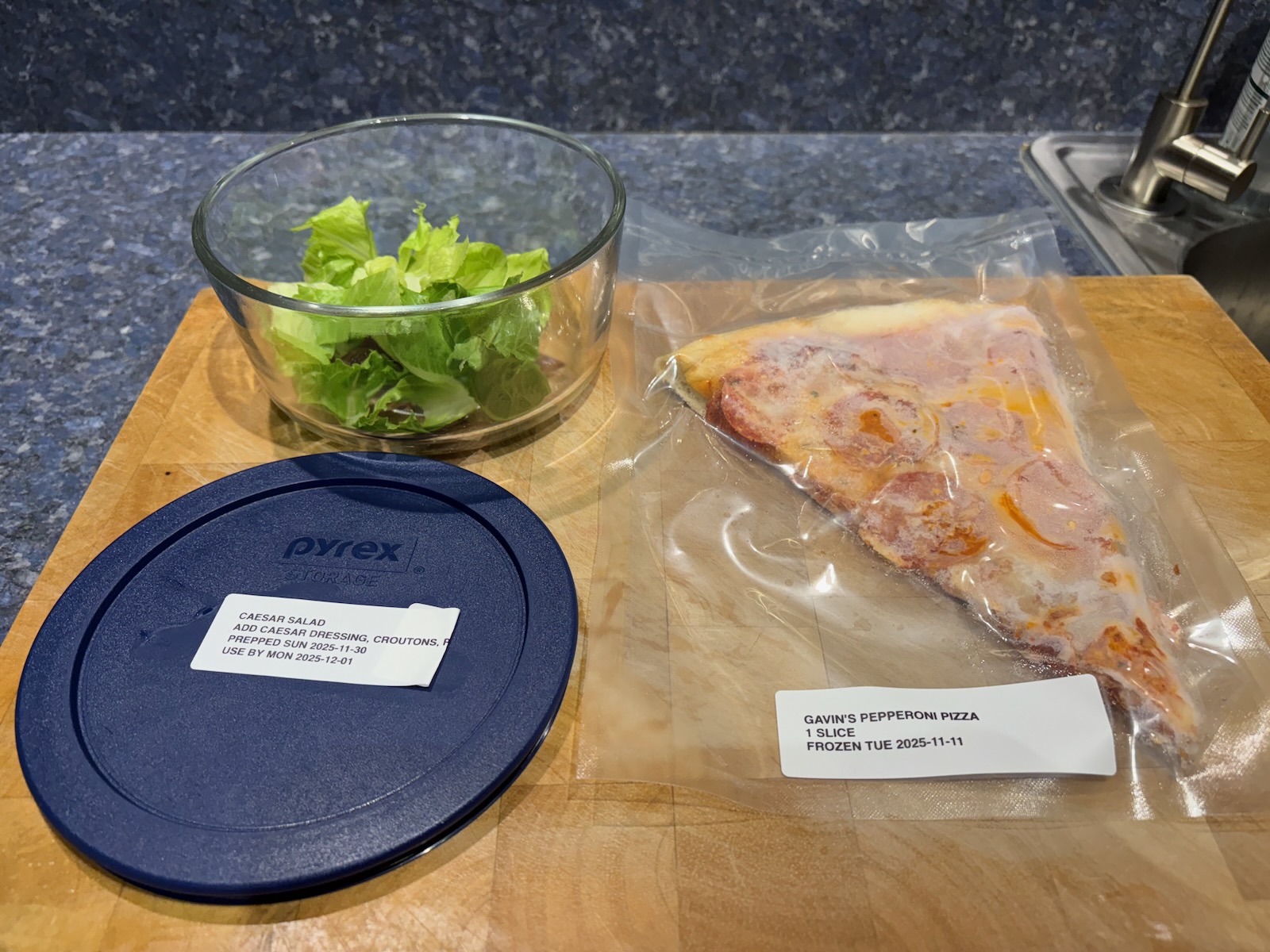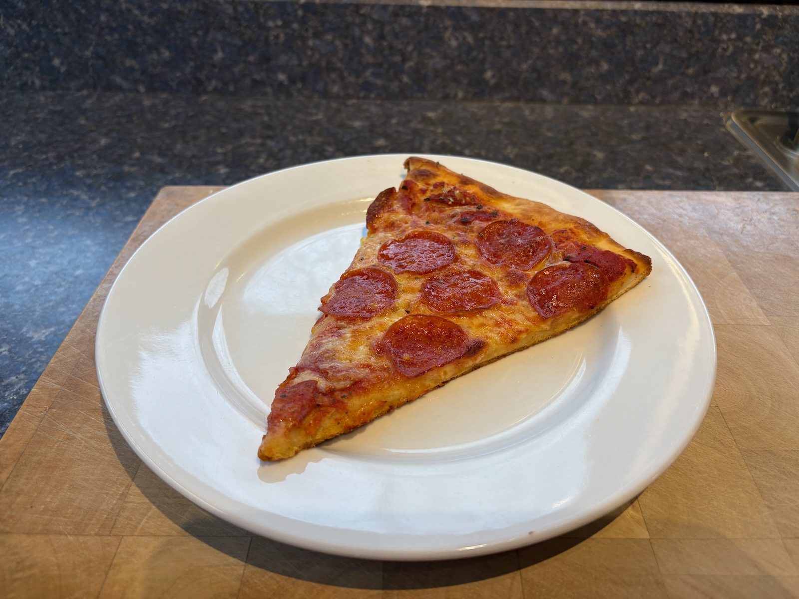 Dinner: 1 slice of pepperoni pizza from Gavin's in Sidney, NY. It was vacuum sealed and frozen so I reheated it from frozen in the sous vide at 140°F, then transferred it to the Breville SmartOven, 400°F for 3 minutes, plus the preheat time, on a sheet pan.