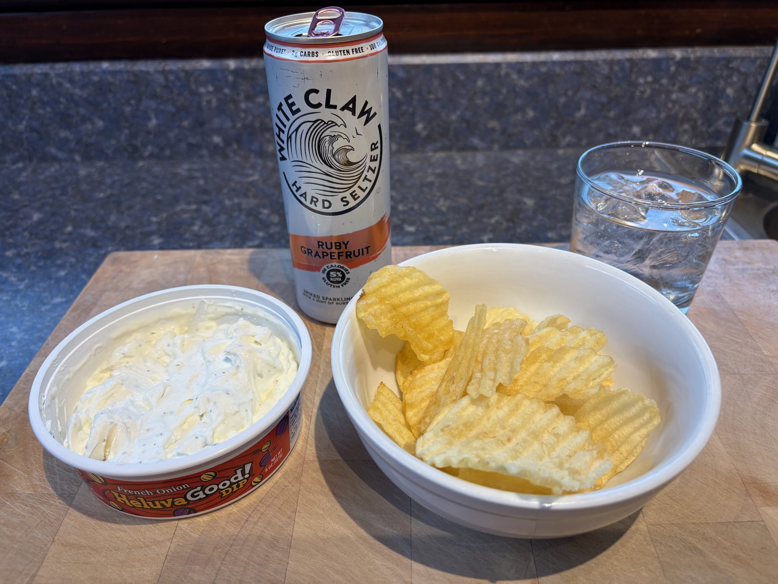 Snack: 1.0 oz. potato chips with French onion dip. White Claw grapefruit.