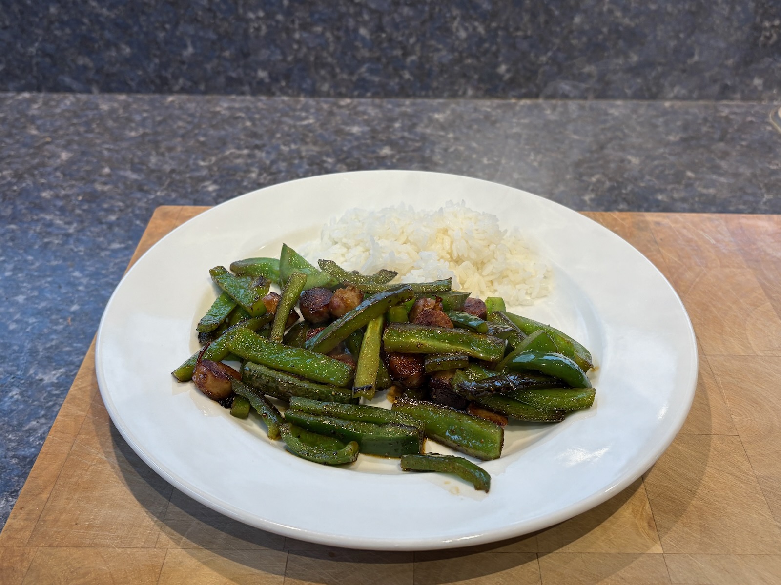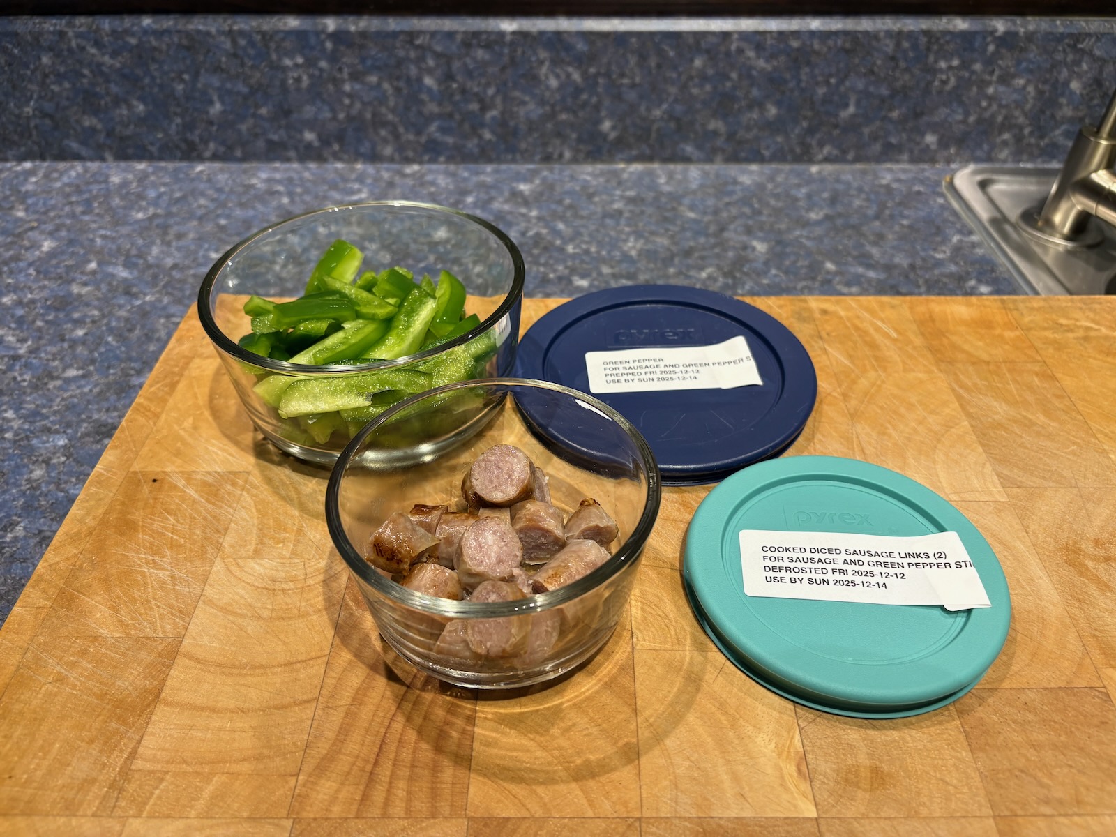 Dinner: Sausage and green pepper stir-fry. Rice. A half glass of Bota Box sauvignon blanc. I forgot to take a picture but it looked like this: