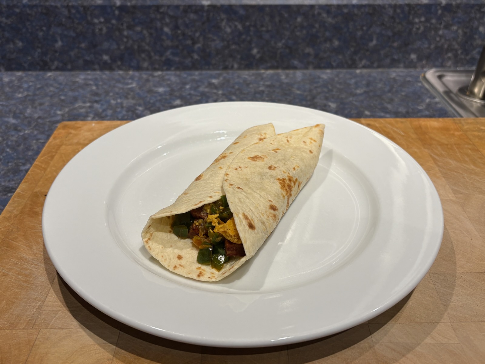 Breakfast: Chorizo breakfast burrito with chorizo, onion, green pepper, jalapeño, and egg. Reheat of the filling I cooked Saturday and froze, in a freshly heated flour tortilla.