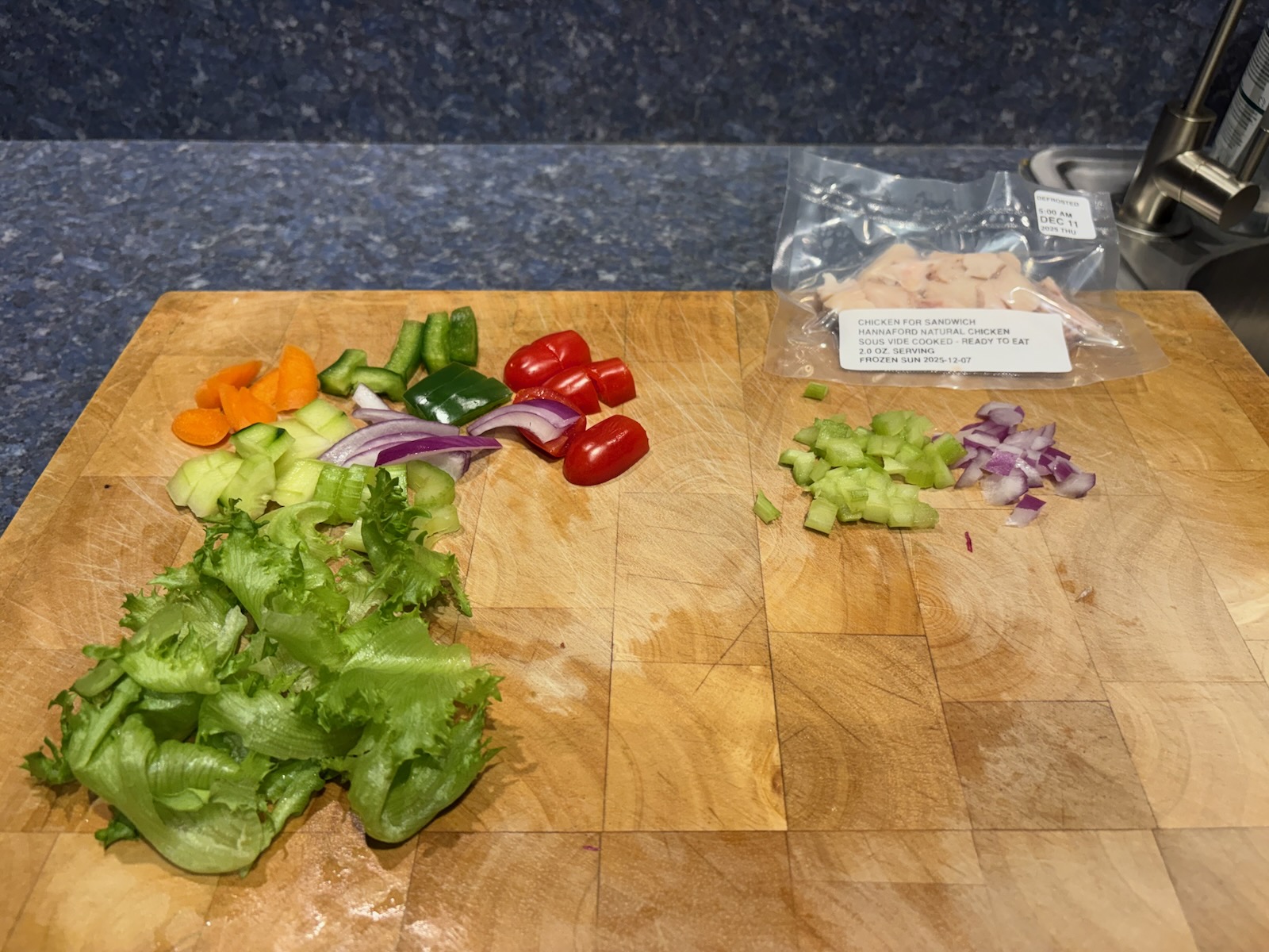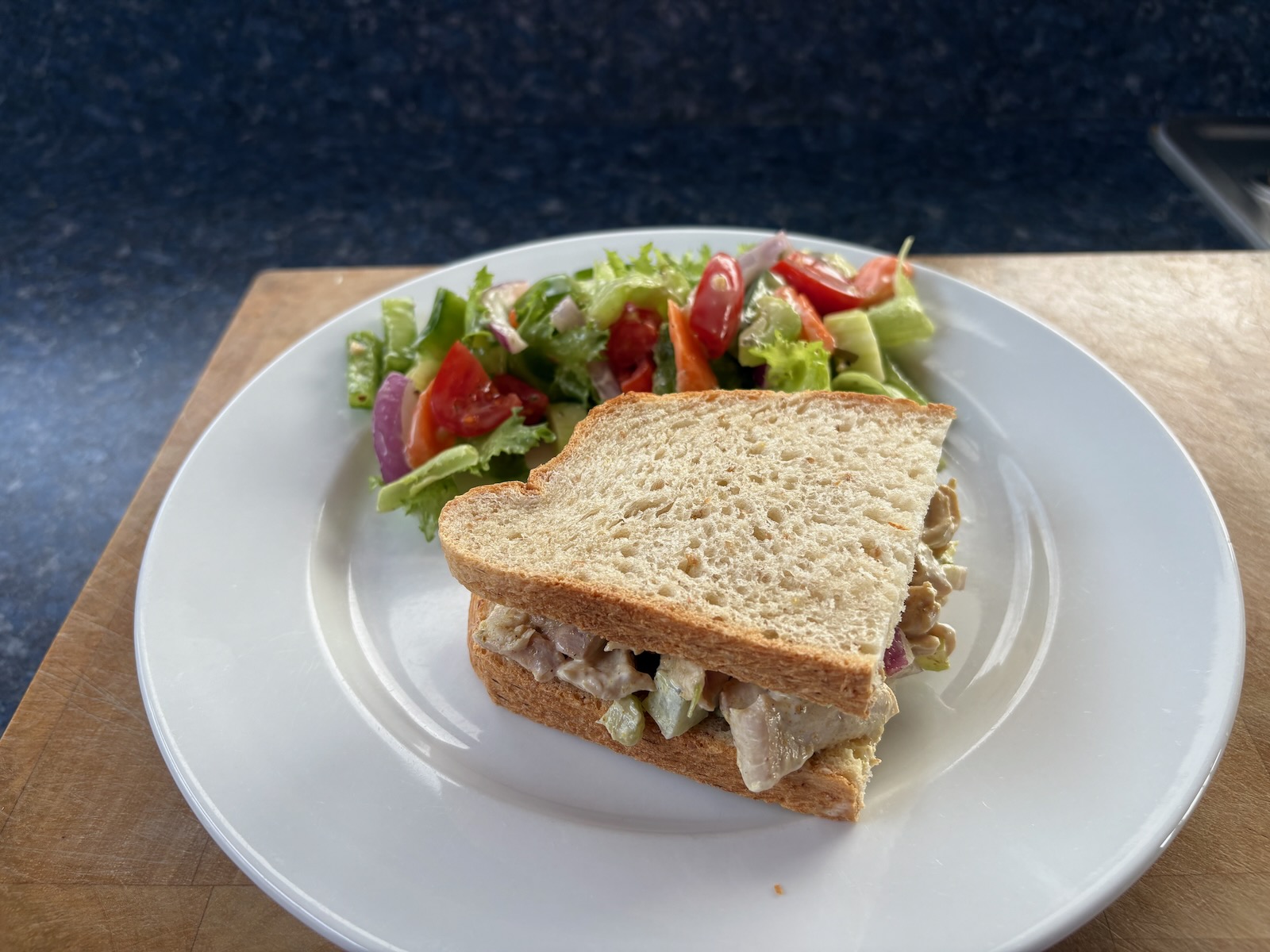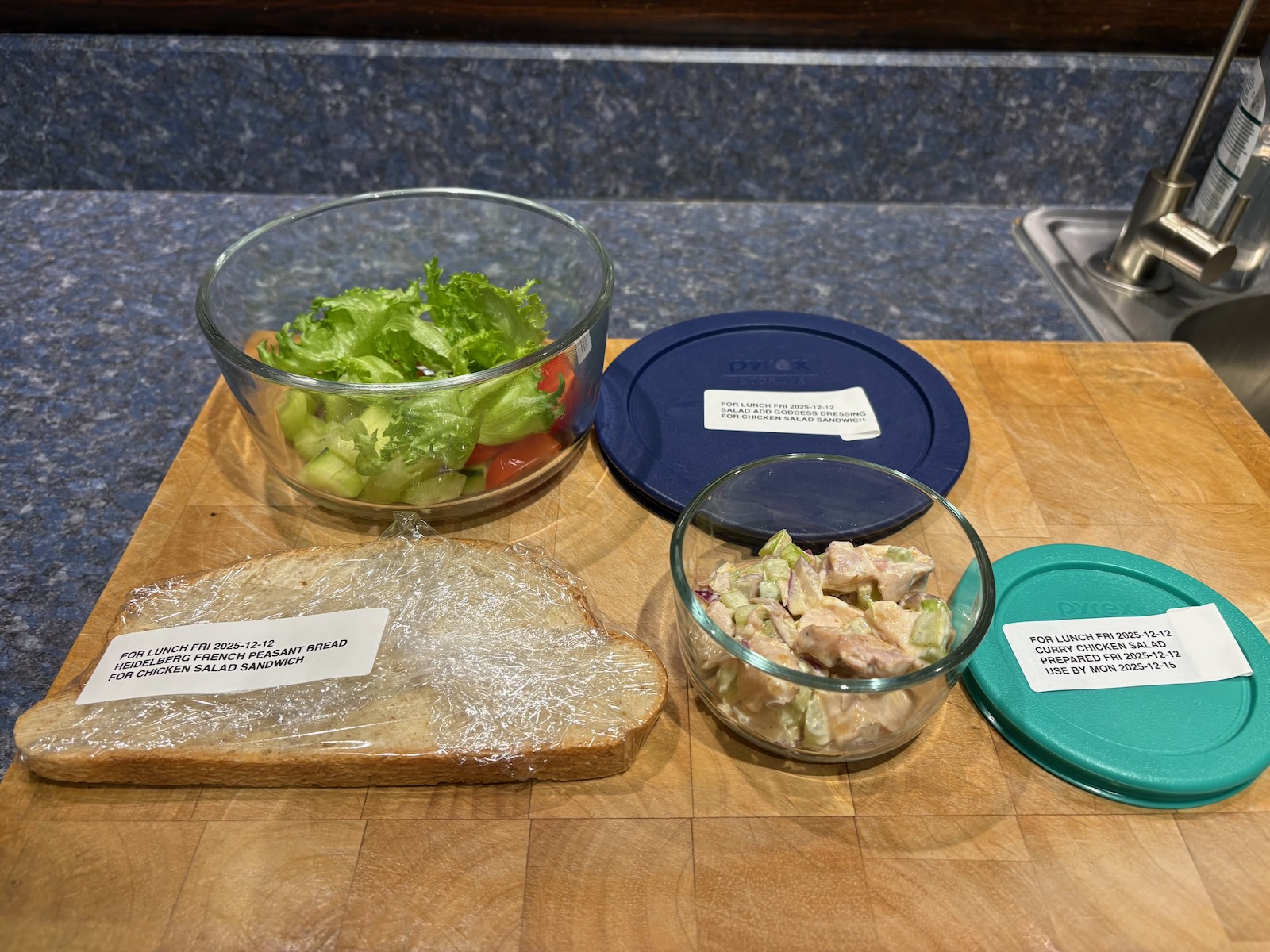 Lunch: Curry chicken salad sandwich with 2.0 oz. chicken on Heidelberg French peasant bread. Side salad with lettuce mix, cucumber, tomato, celery, red onion, and Annie's green goddess dressing.