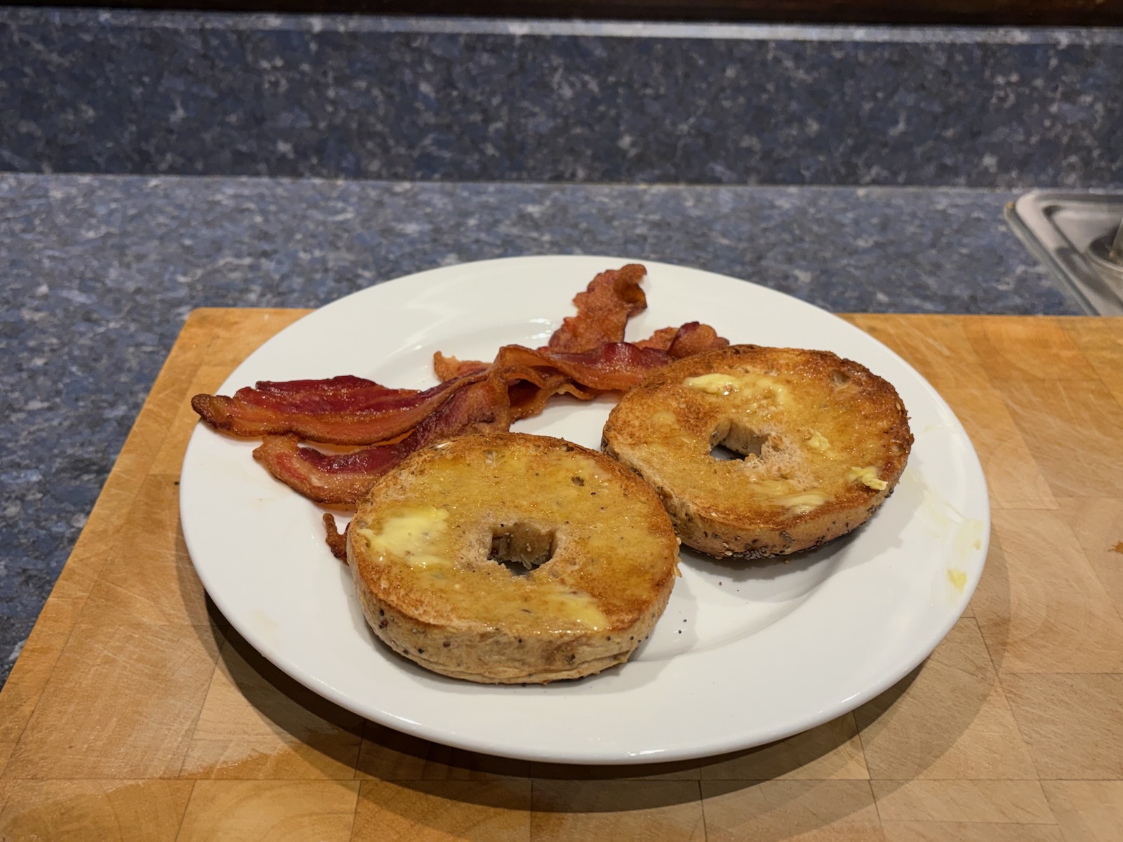 Breakfast: Toasted everything bagel with butter. Side of bacon.