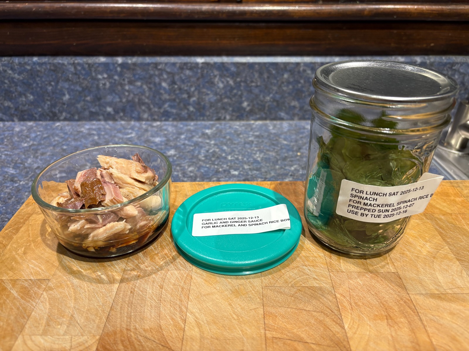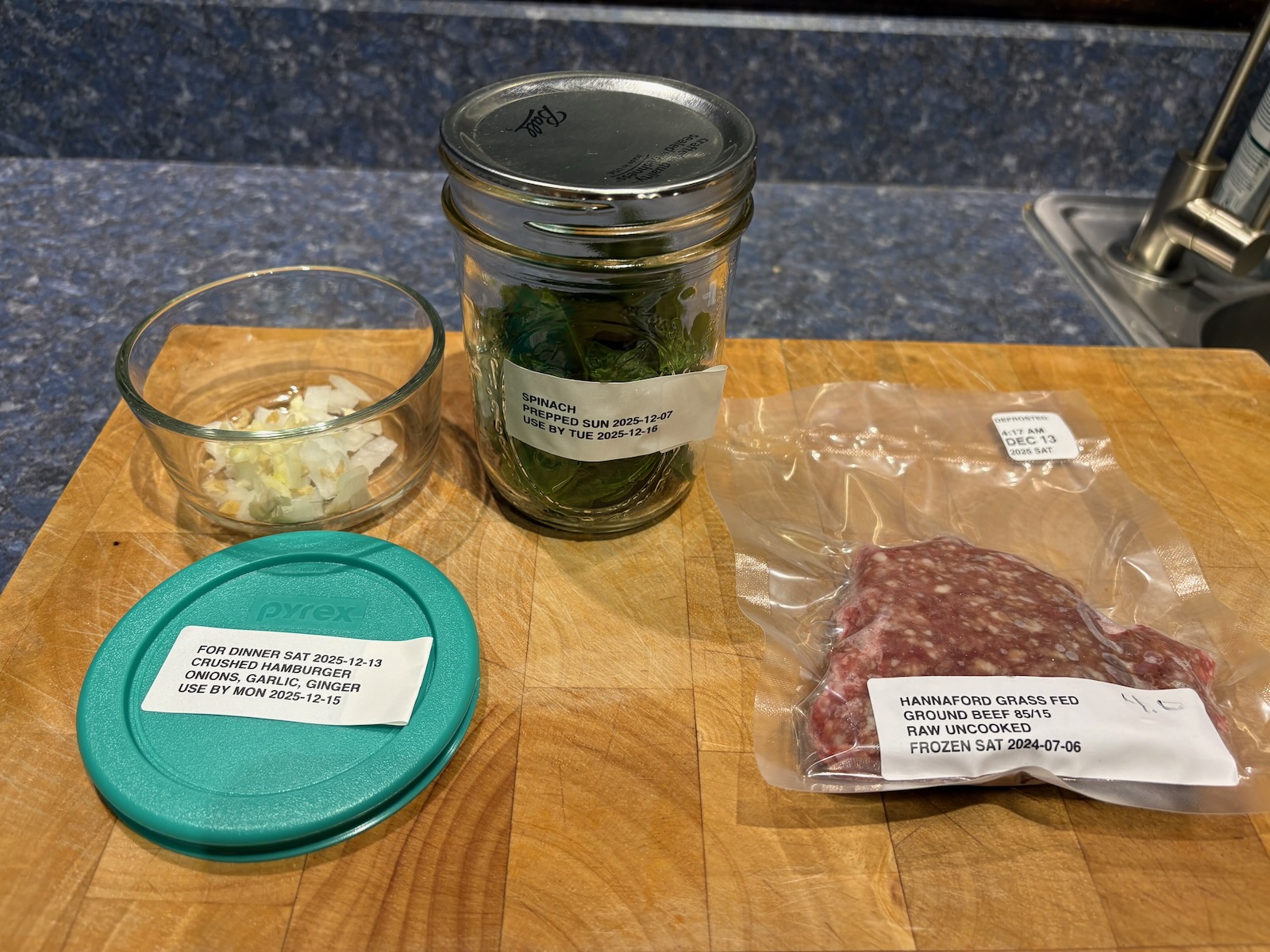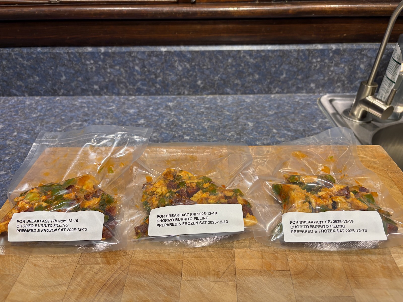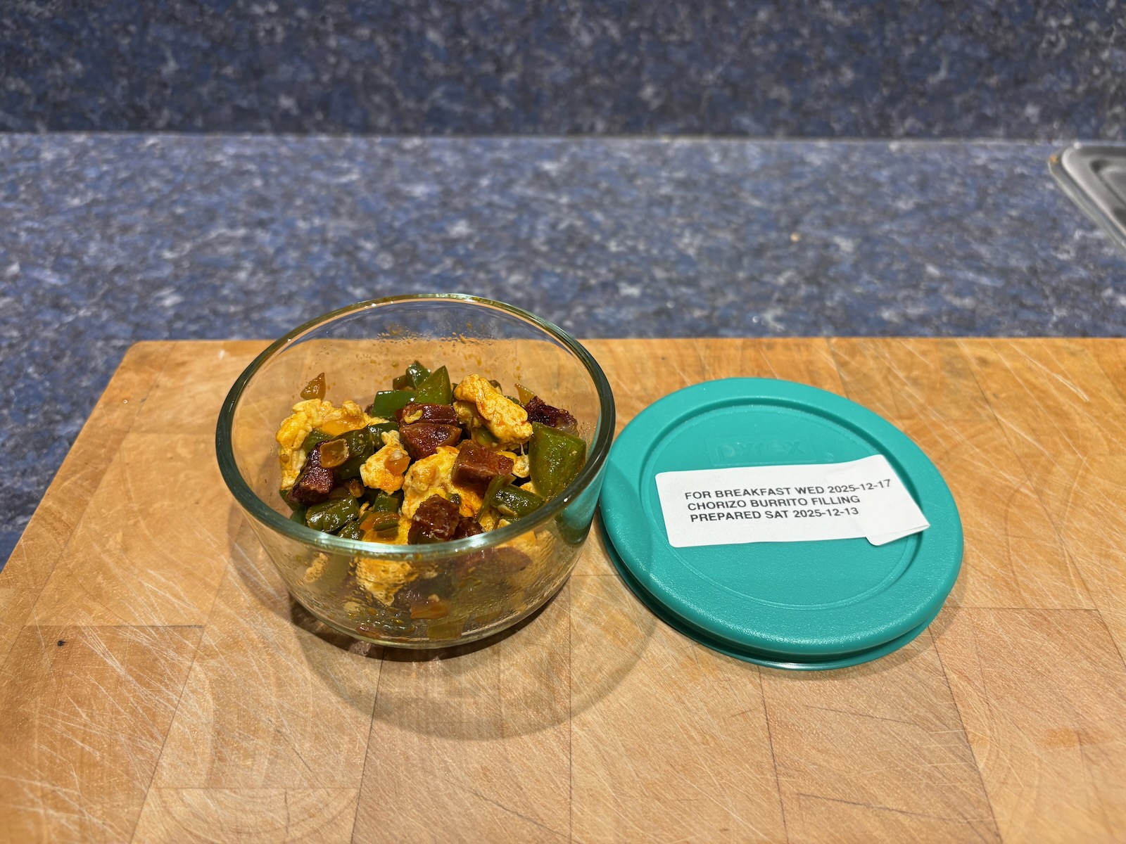 Made a double batch of the filling for chorizo breakfast burrito (updated recipe) with chorizo, onion, green pepper, jalapeño, and egg for breakfast Wednesday. Refrigerated one serving for Wednesday and froze 3 servings.