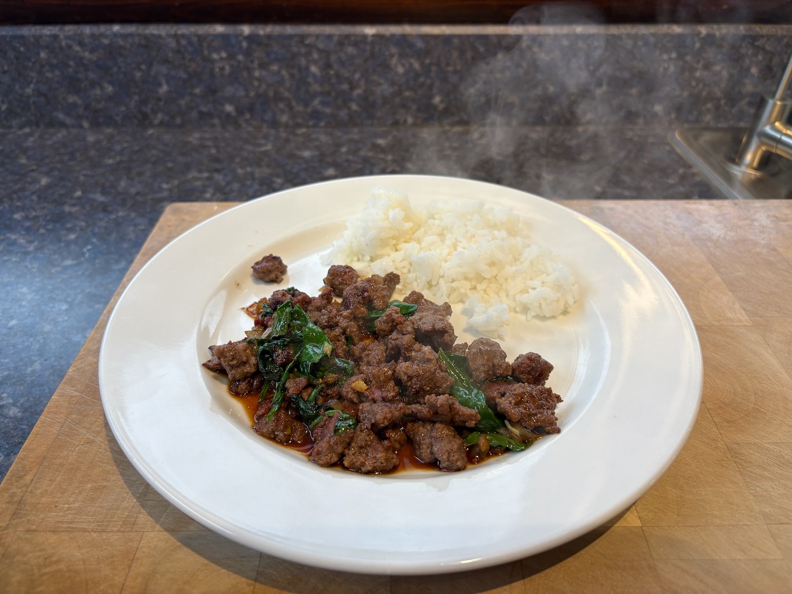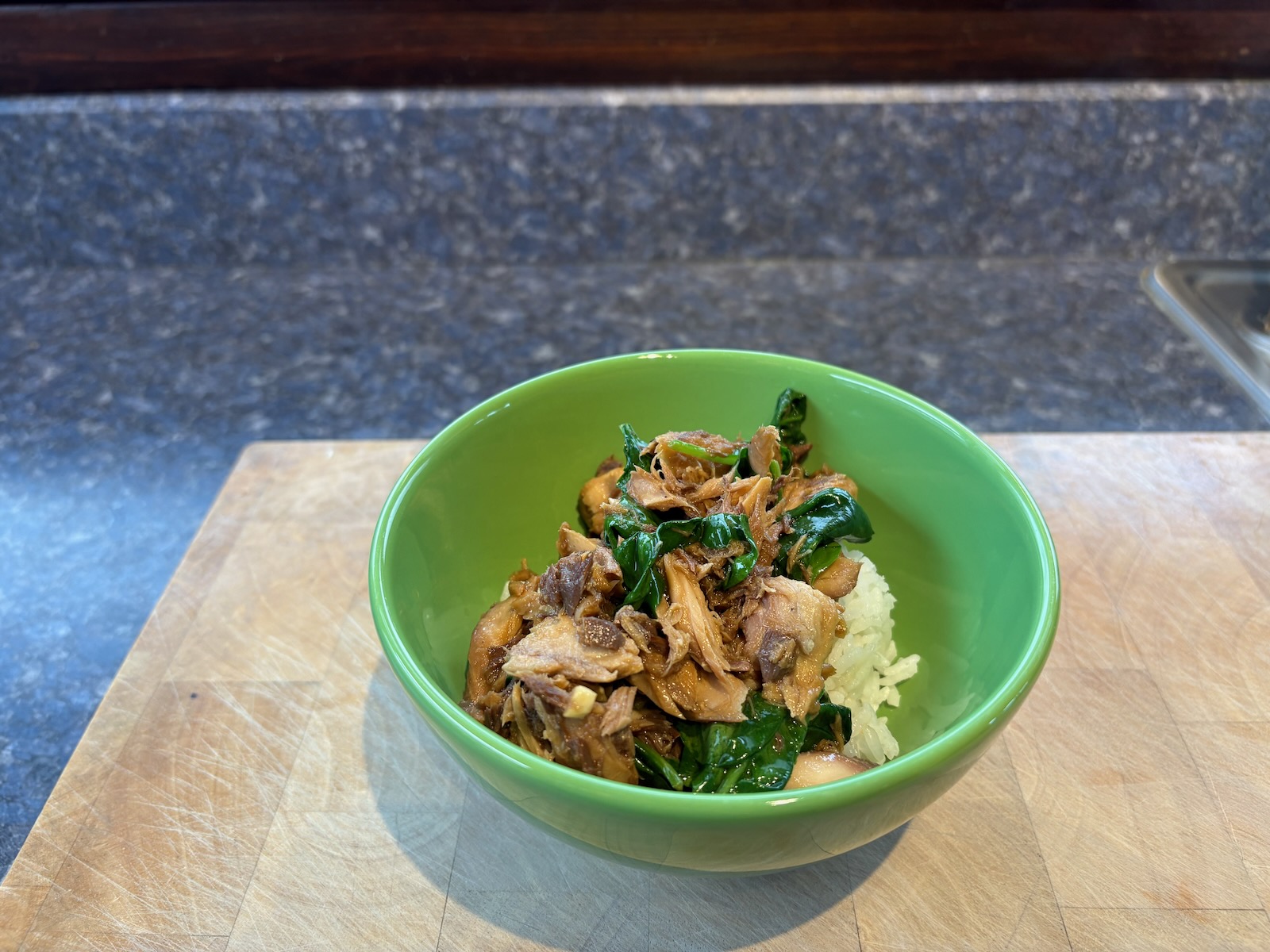Dinner: Crushed hamburger (4.0 oz. before cooking) with spinach and rice. A half glass of Bota Box cabernet sauvignon.