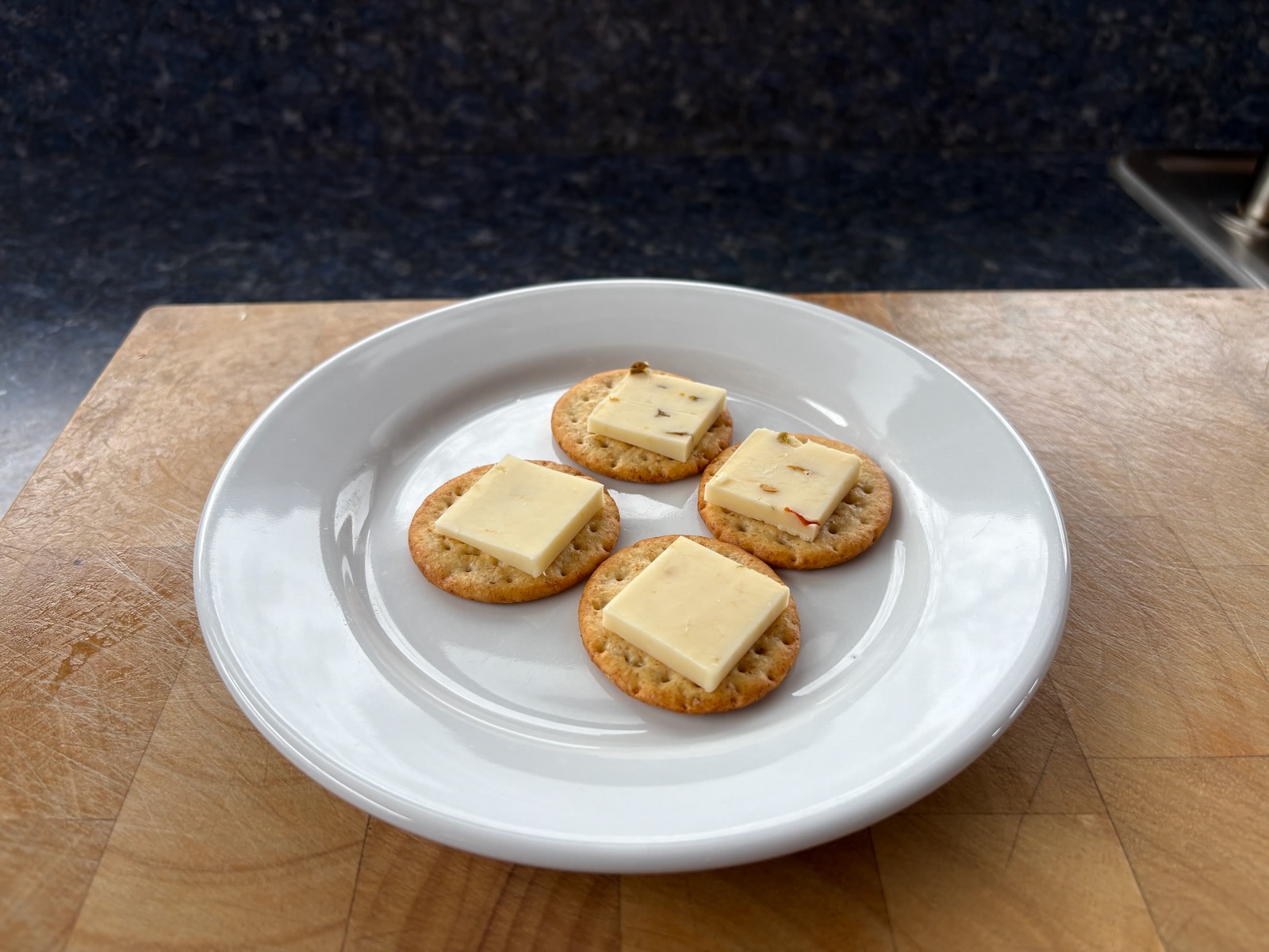 Snack: 1.0 oz. Sriracha chex mix. 0.8 oz. peanuts (136 cal). 0.8 oz. cashews (128 cal). Skinny Pop cheddar jalapeño popcorn (70 cal).