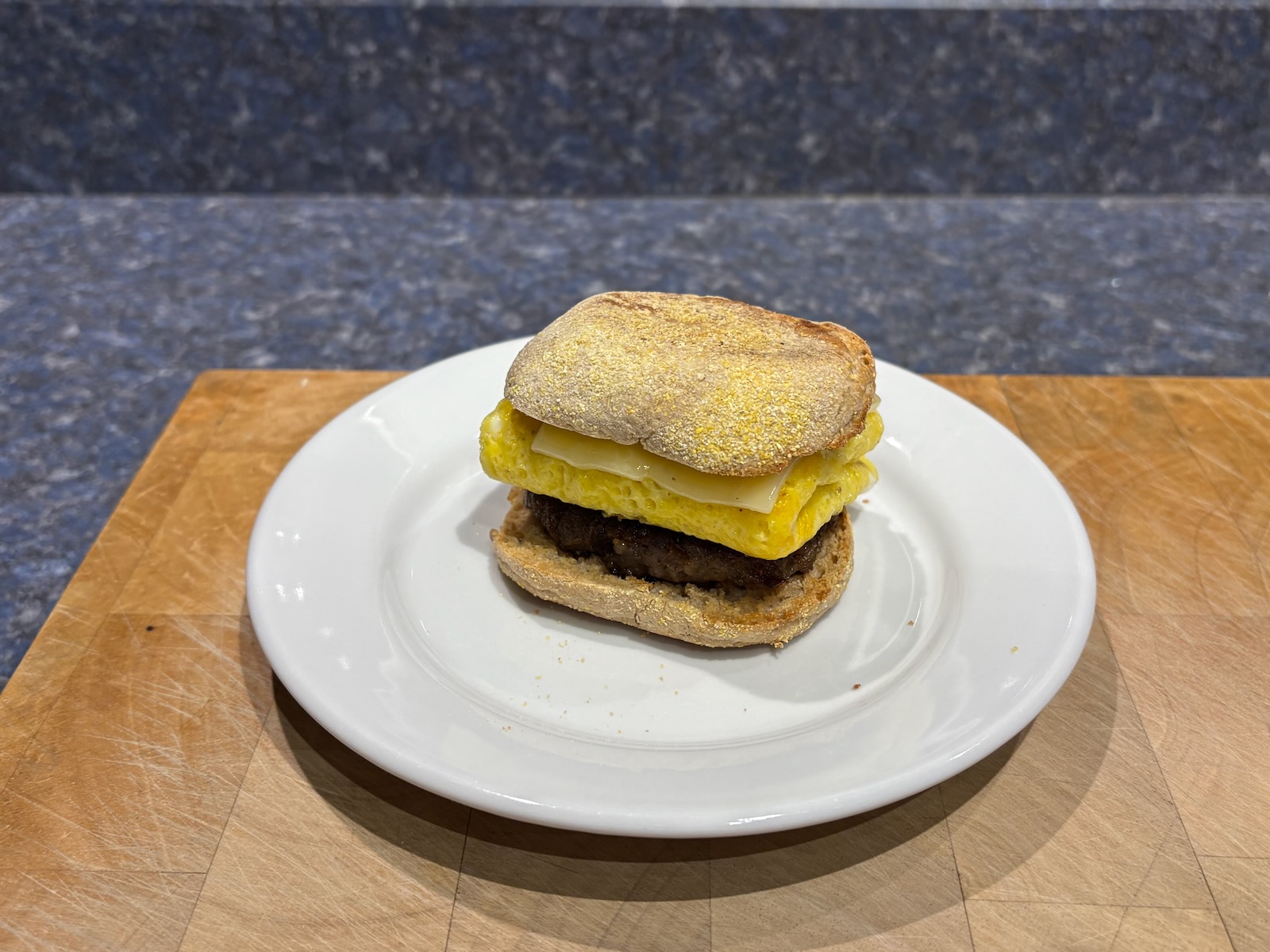 Breakfast: Sausage, egg, and cheese breakfast sandwich on wheat English muffin.