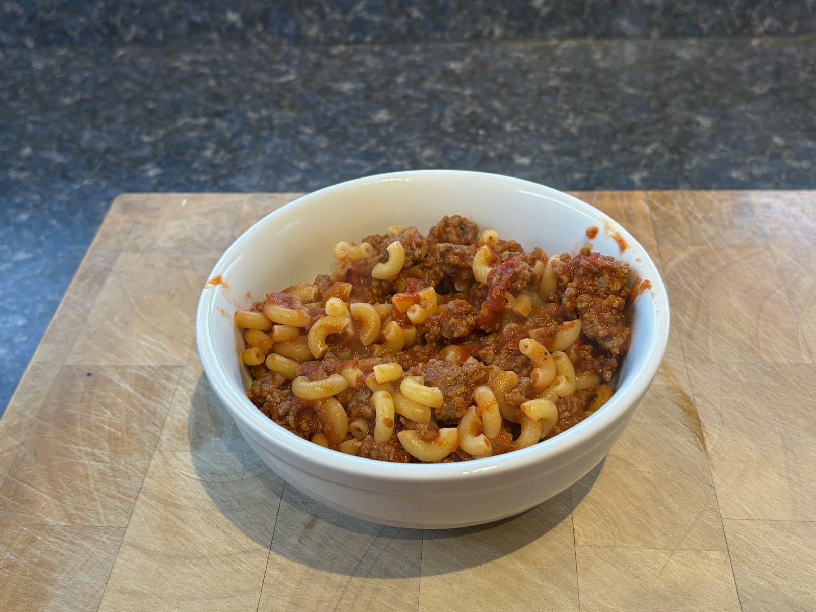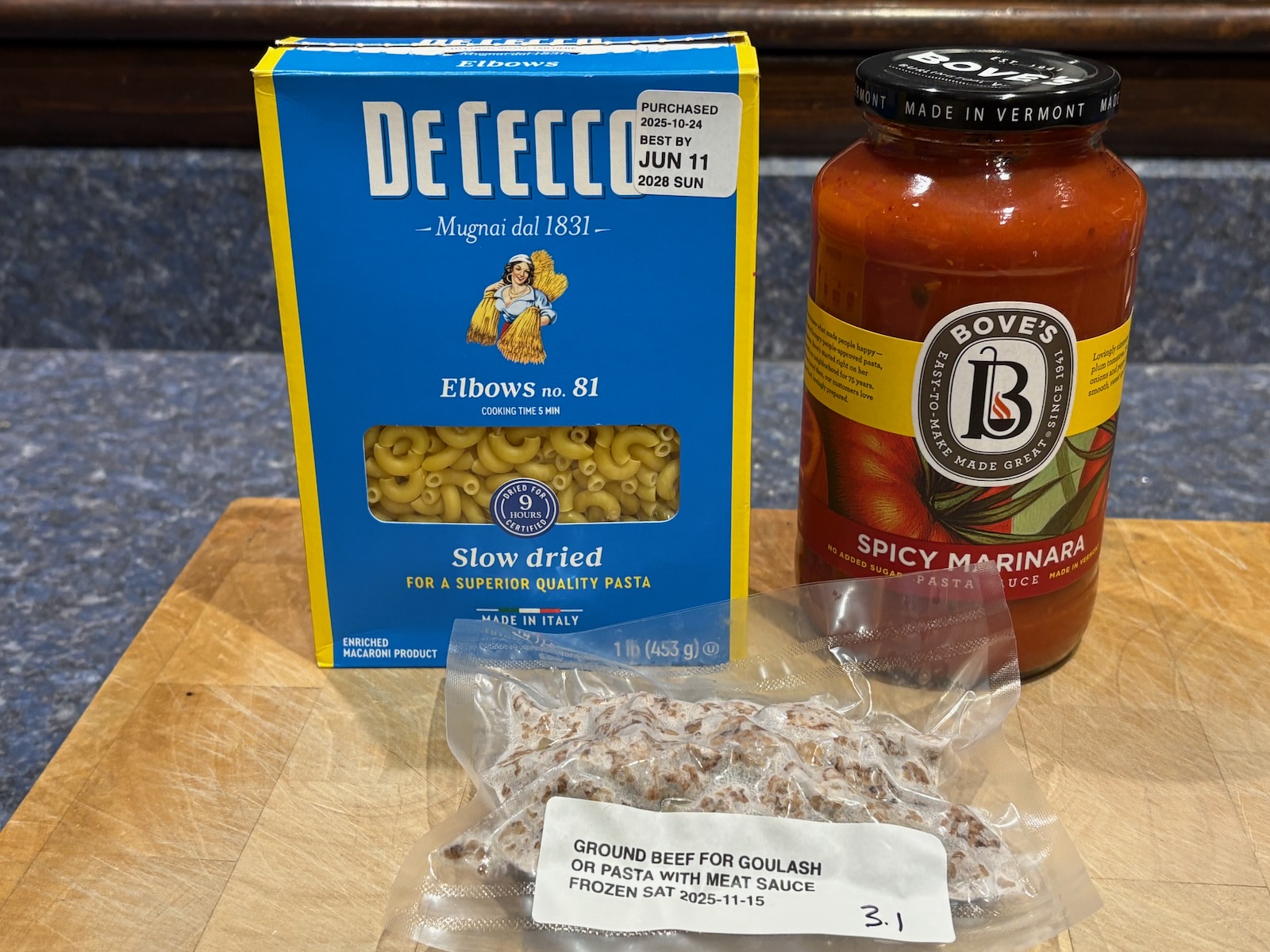 Dinner: Simple goulash with 3.1 oz. ground beef, onion, and garlic (previously frozen), 4.5 oz. marinara, and 1.6 oz. pasta elbows. A half glass of Bota Box pinot noir.