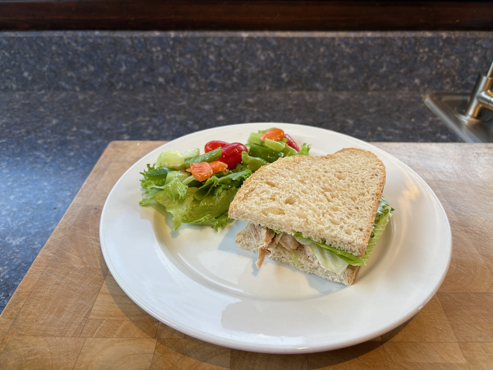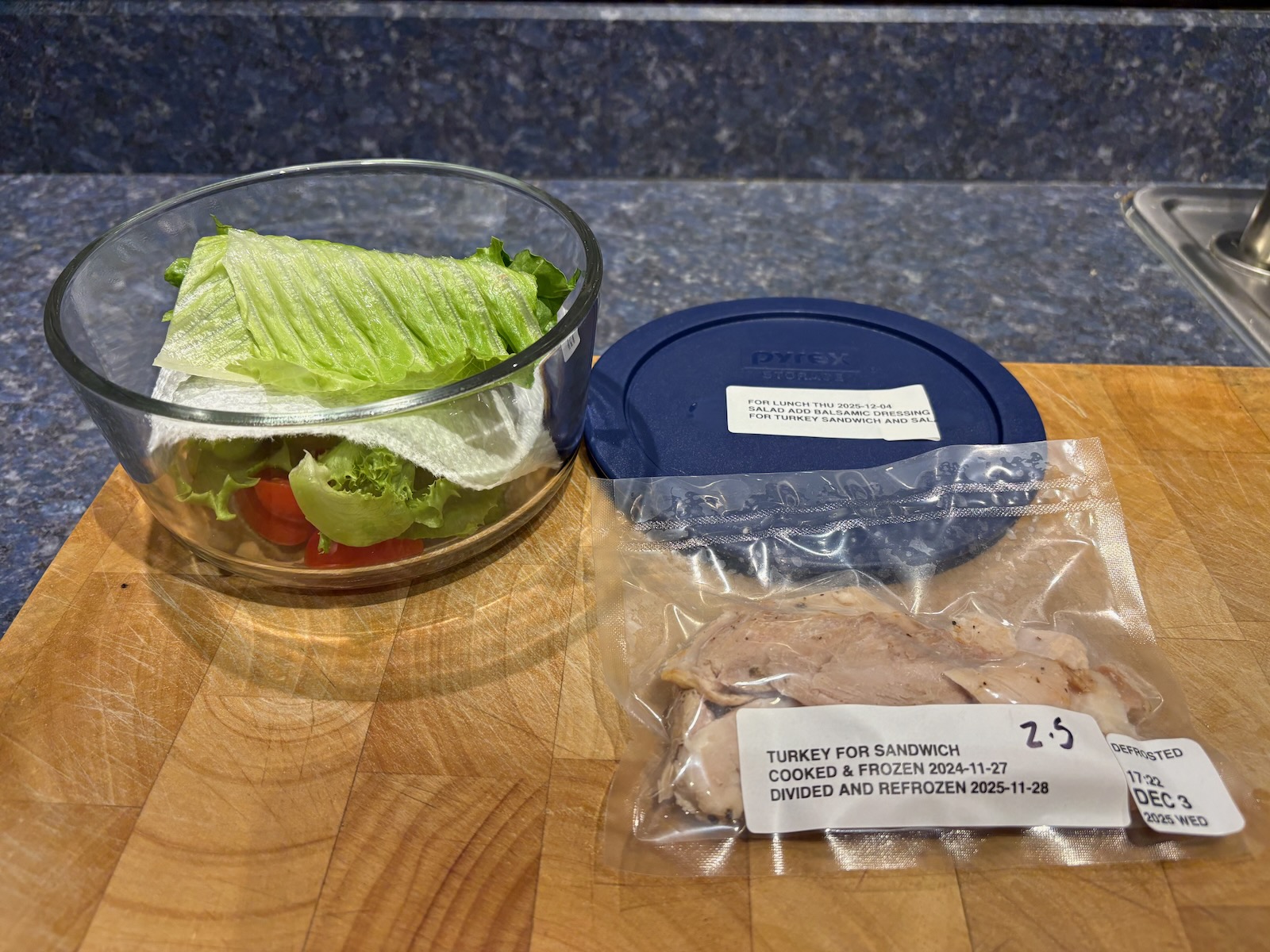 Lunch: Turkey sandwich with 2.5 oz. homemade turkey, lettuce, and mayo on Heidelberg French peasant bread. A side salad with lettuce mix, cucumber, tomato, carrot, green pepper, and balsamic dressing.