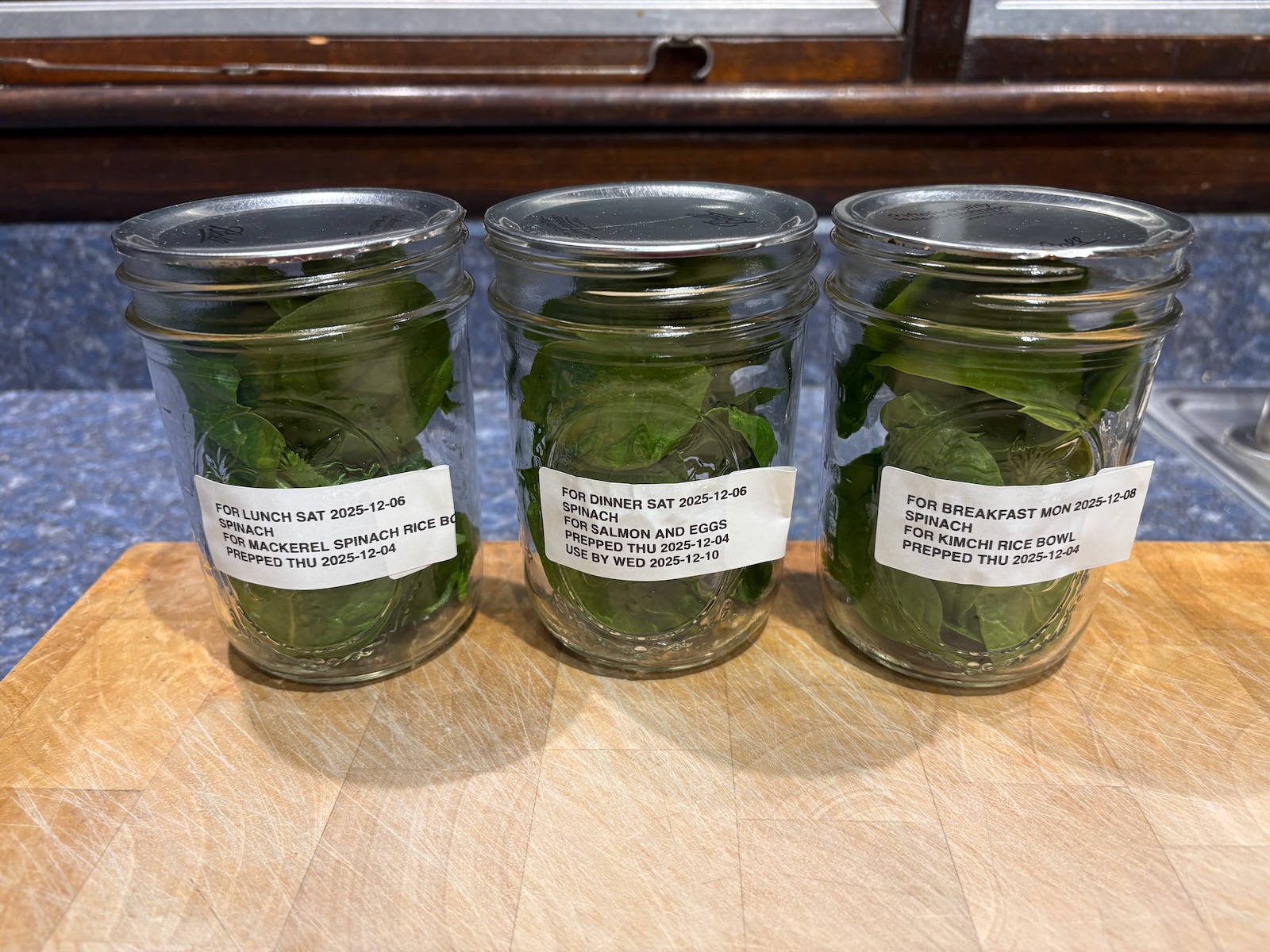 Vacuum sealed spinach for mackerel and spinach rice bowl (Saturday lunch), salmon and eggs (Saturday dinner), and kimchi spinach rice bowl (Monday breakfast),