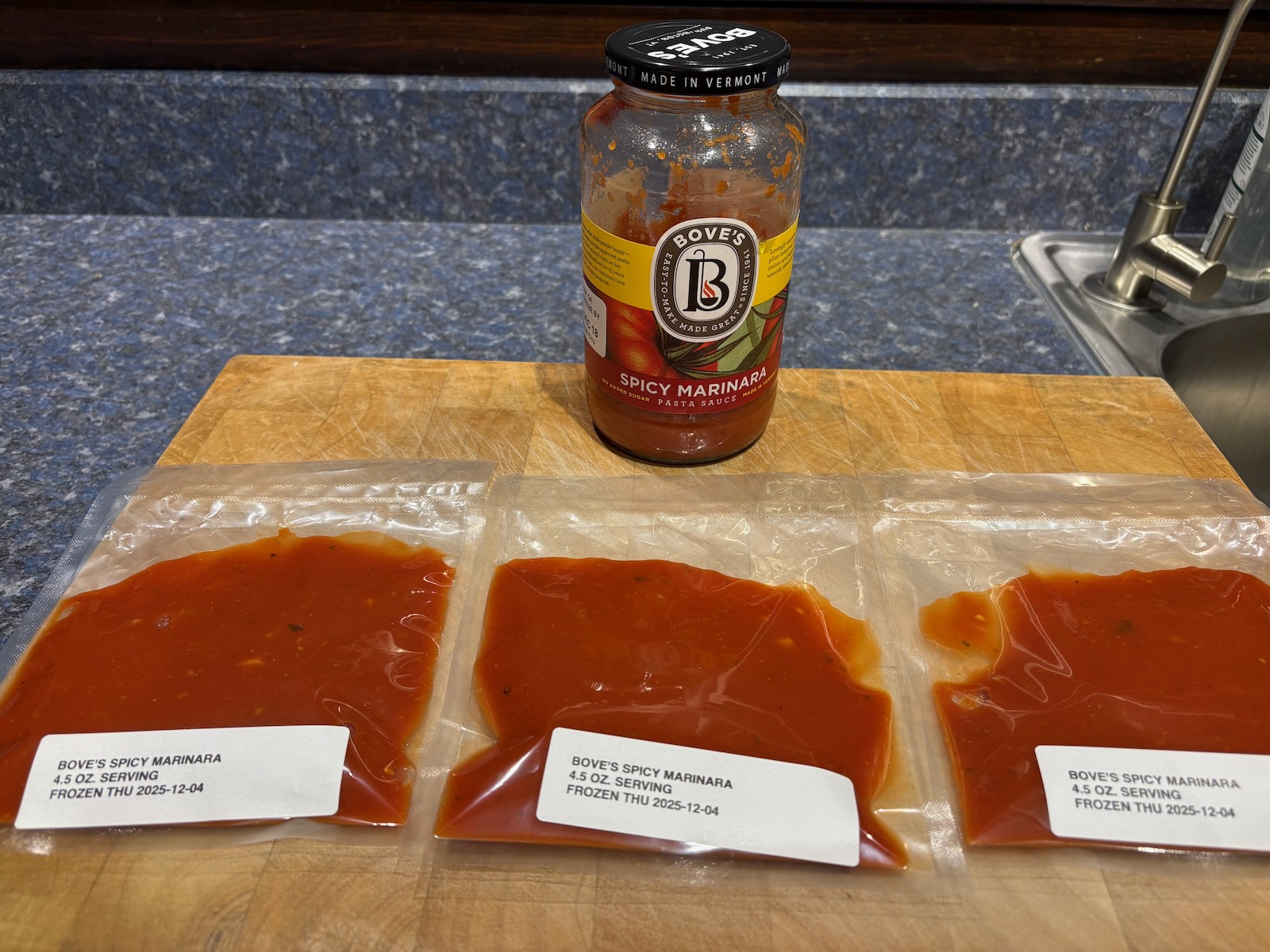 Vacuum sealed and froze 3 servings of marinara, 4.5 oz. each.