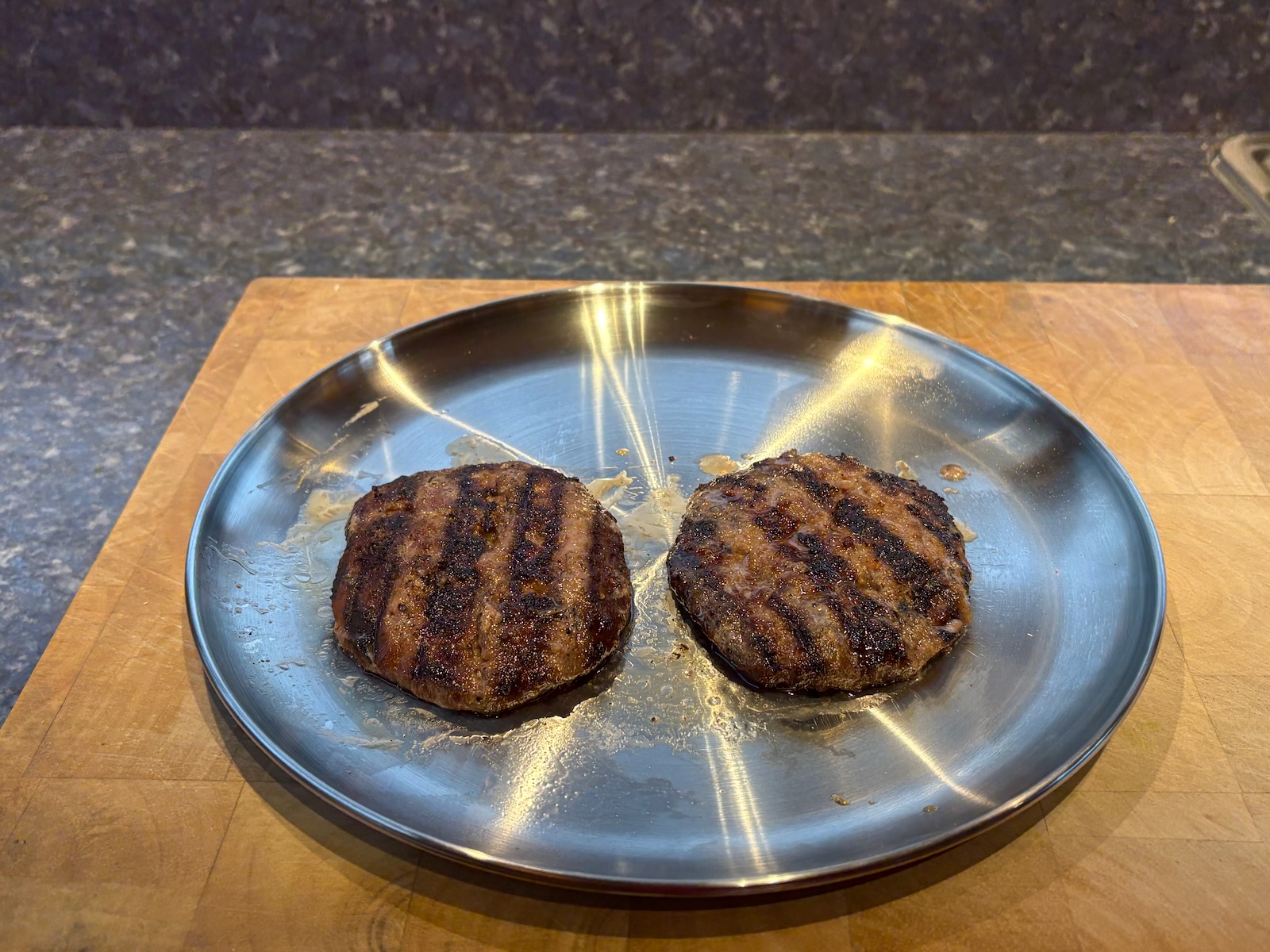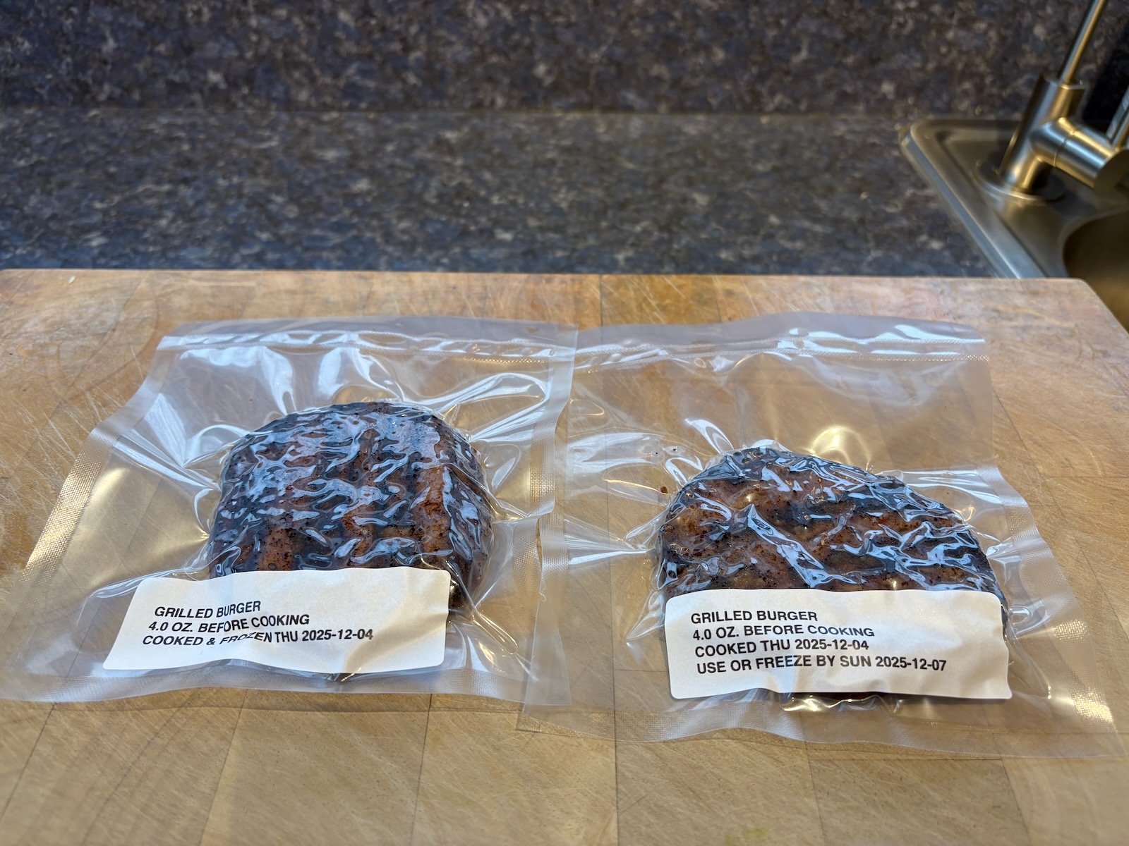 Grilled and vacuum sealed burgers. Saved one for dinner Friday and froze the other.
