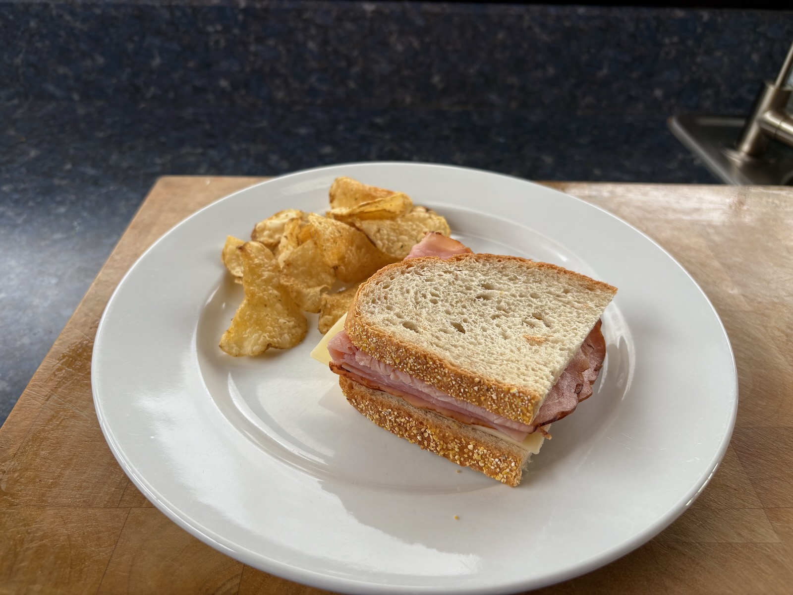 Lunch: Ham and Swiss cheese sandwich with 2.3 oz. ham on Heidelberg French peasant bread. Kettle Chips hot jalapeƱo potato chips.