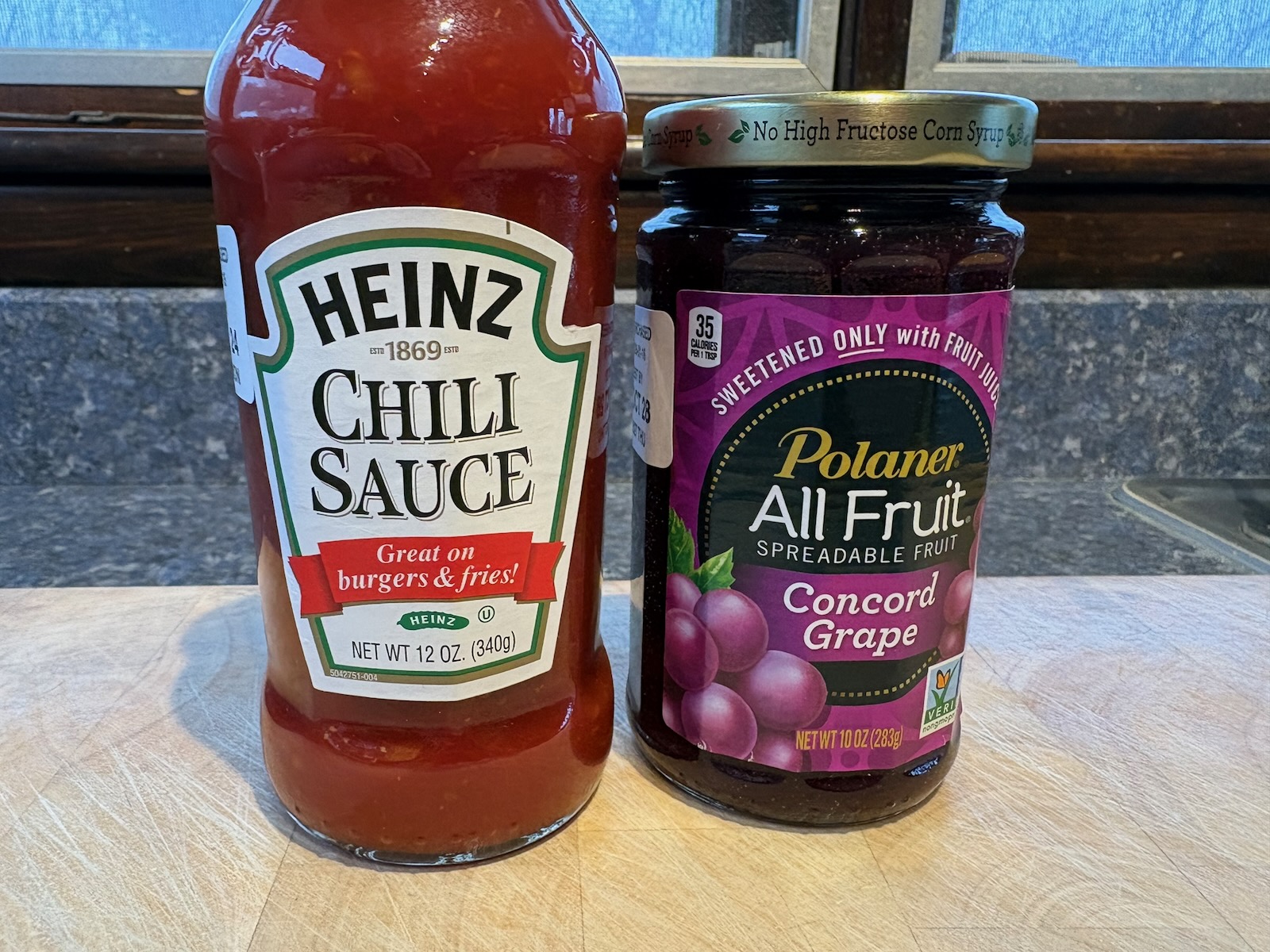 One 18 oz. package of pre-cooked mini-meatballs (1/2 oz each, 36 count) works well. And the sauce of Polaner All Fruit Concord Grape (10 oz. jar) and Heinz Chili Sauce (12 oz. jar).
